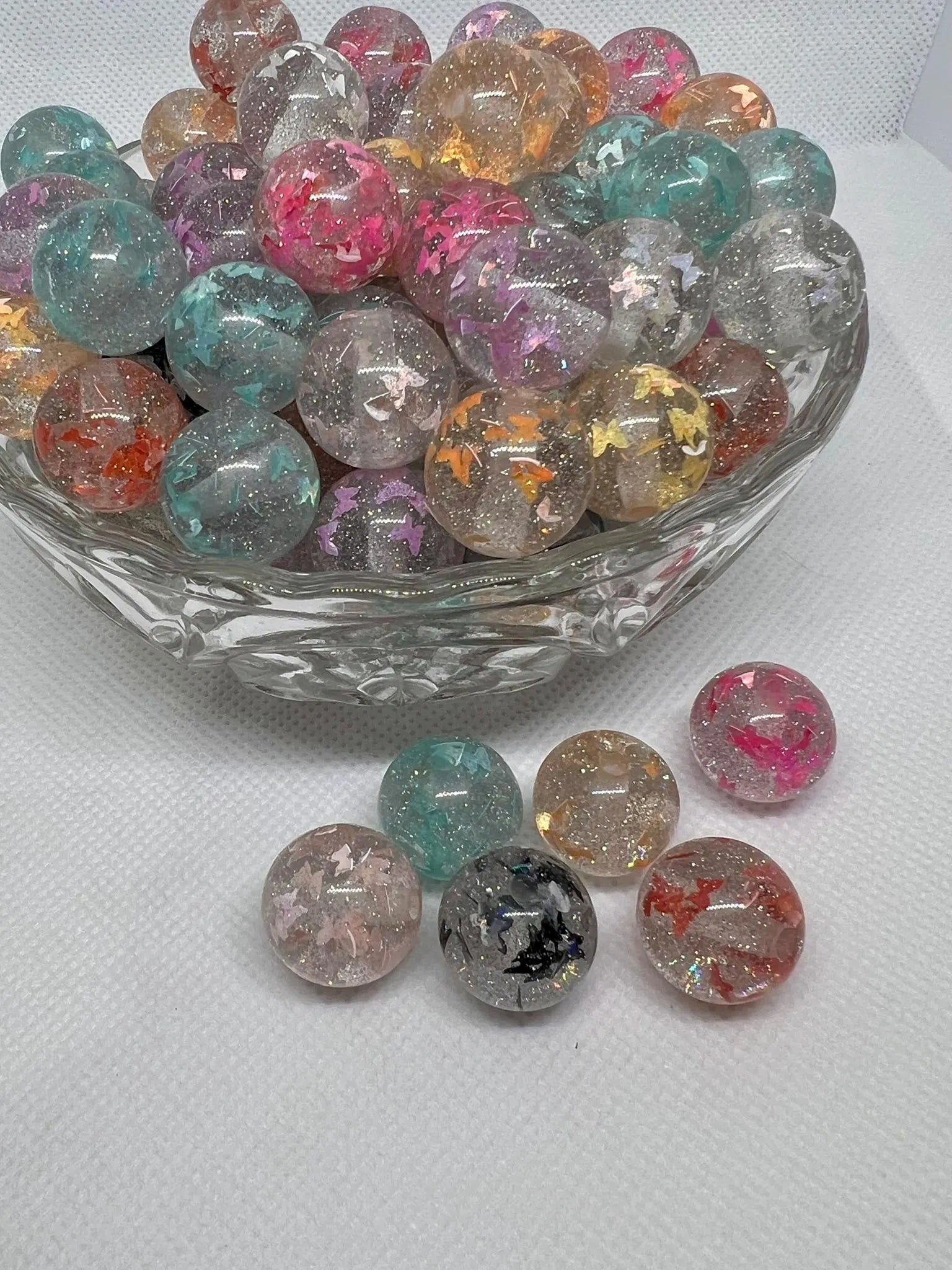 - **Design:** Clear resin beads with glitter and embedded butterfly designs