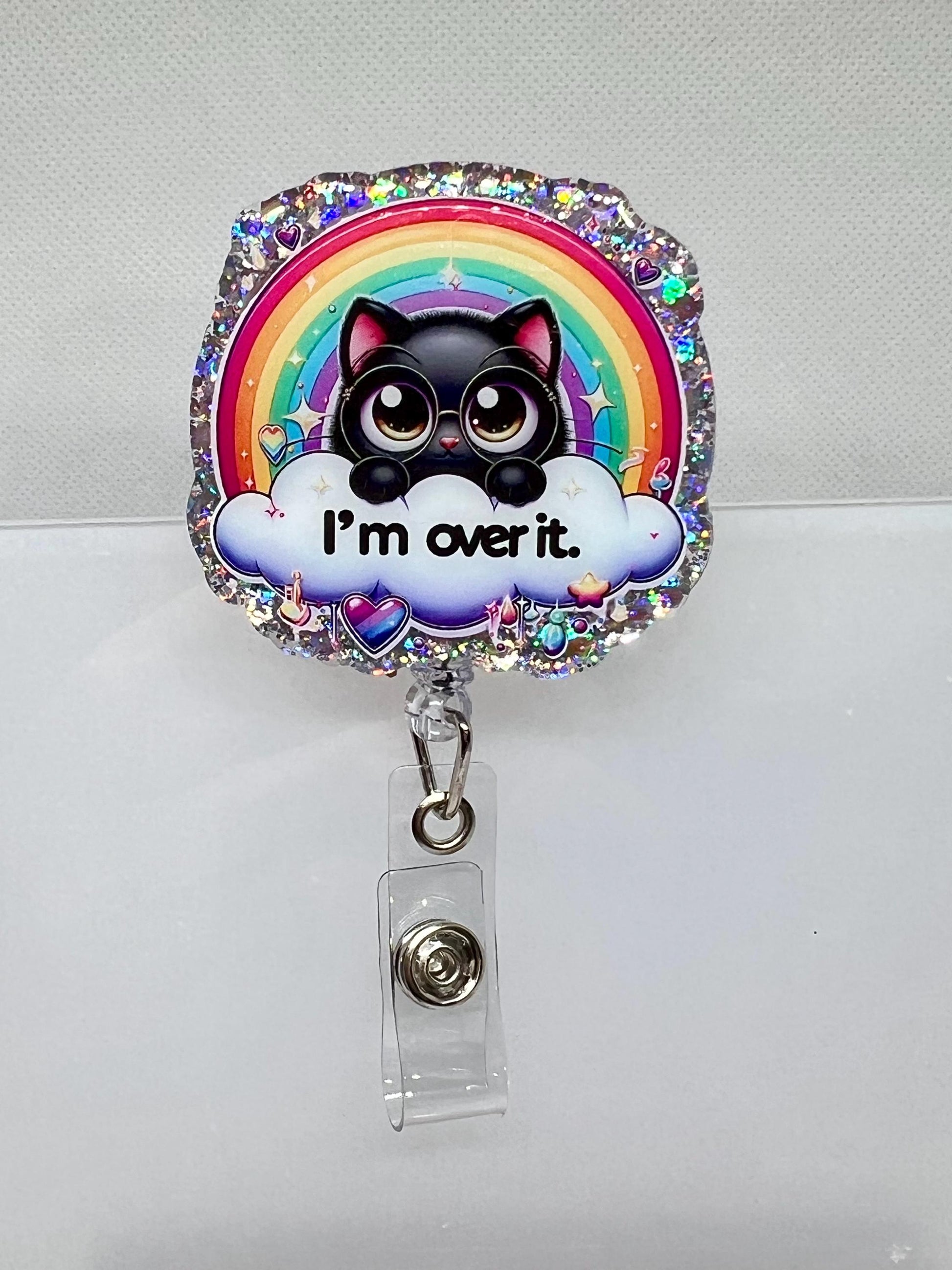 Cute Cat Badge Reel – 'I'm Over It' Rainbow and Cloud Design for Fun and Whimsical ID Holder