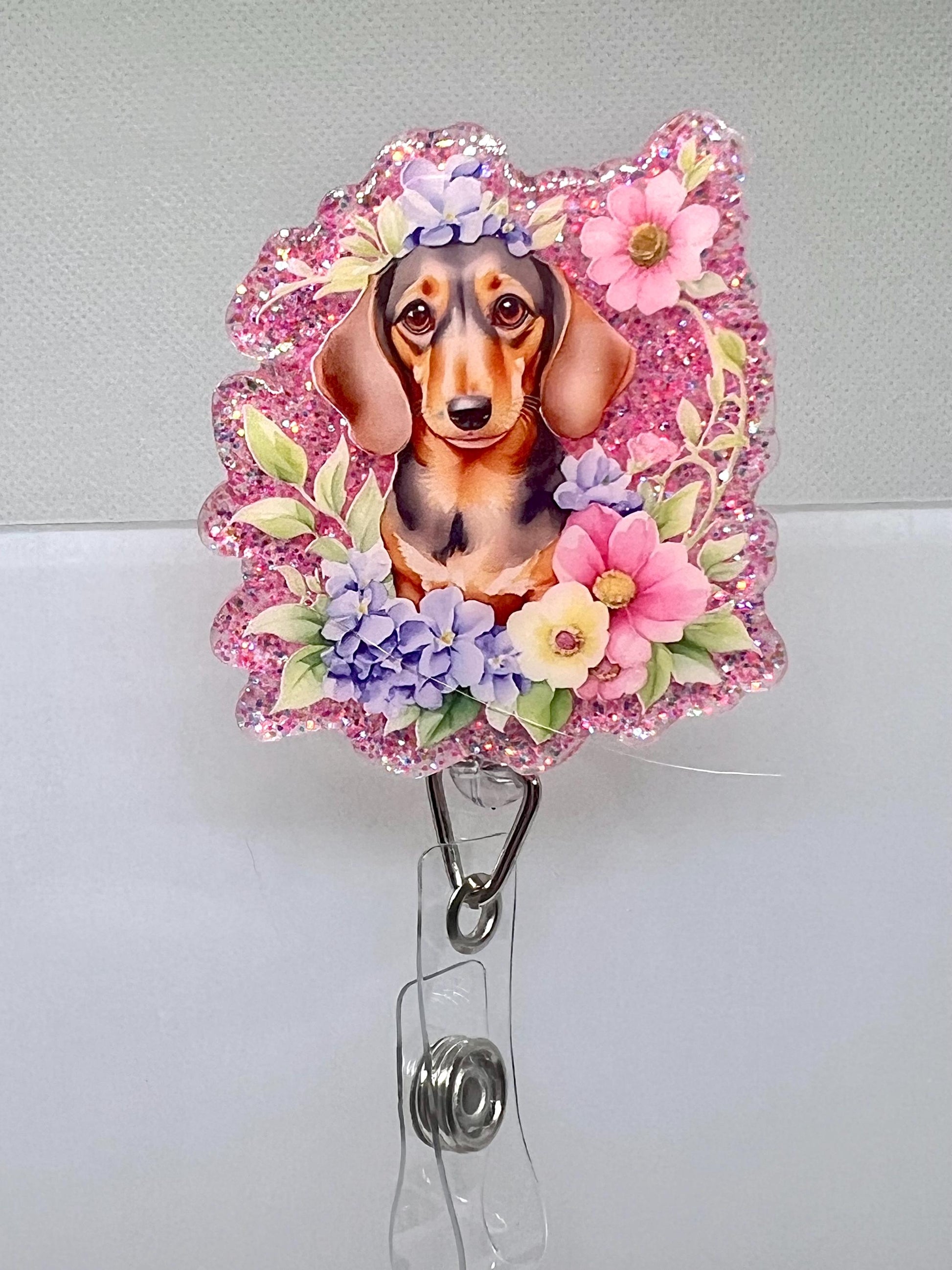 Add a touch of sweetness and charm to your workday with this adorable dachshund-themed floral badge reel! Perfect for pet lovers and dachshund enthusiasts, this accessory blends functionality with a delightful design, ensuring your ID badges or keys are always within reach.