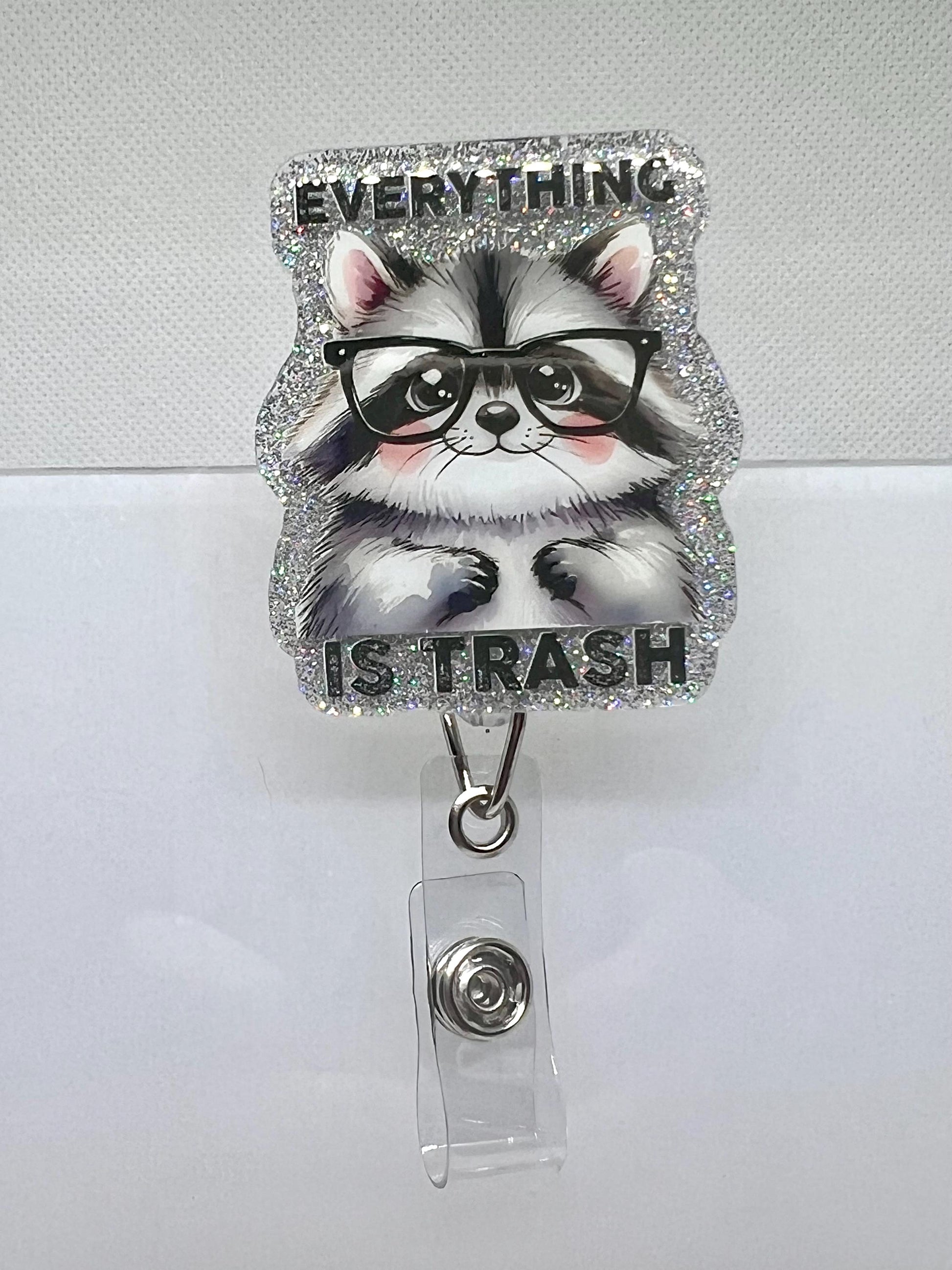 - **Design:** Features a cartoon raccoon wearing stylish glasses surrounded by glittery accents, along with the witty phrase "Everything Is Trash" displayed boldly on the badge reel.