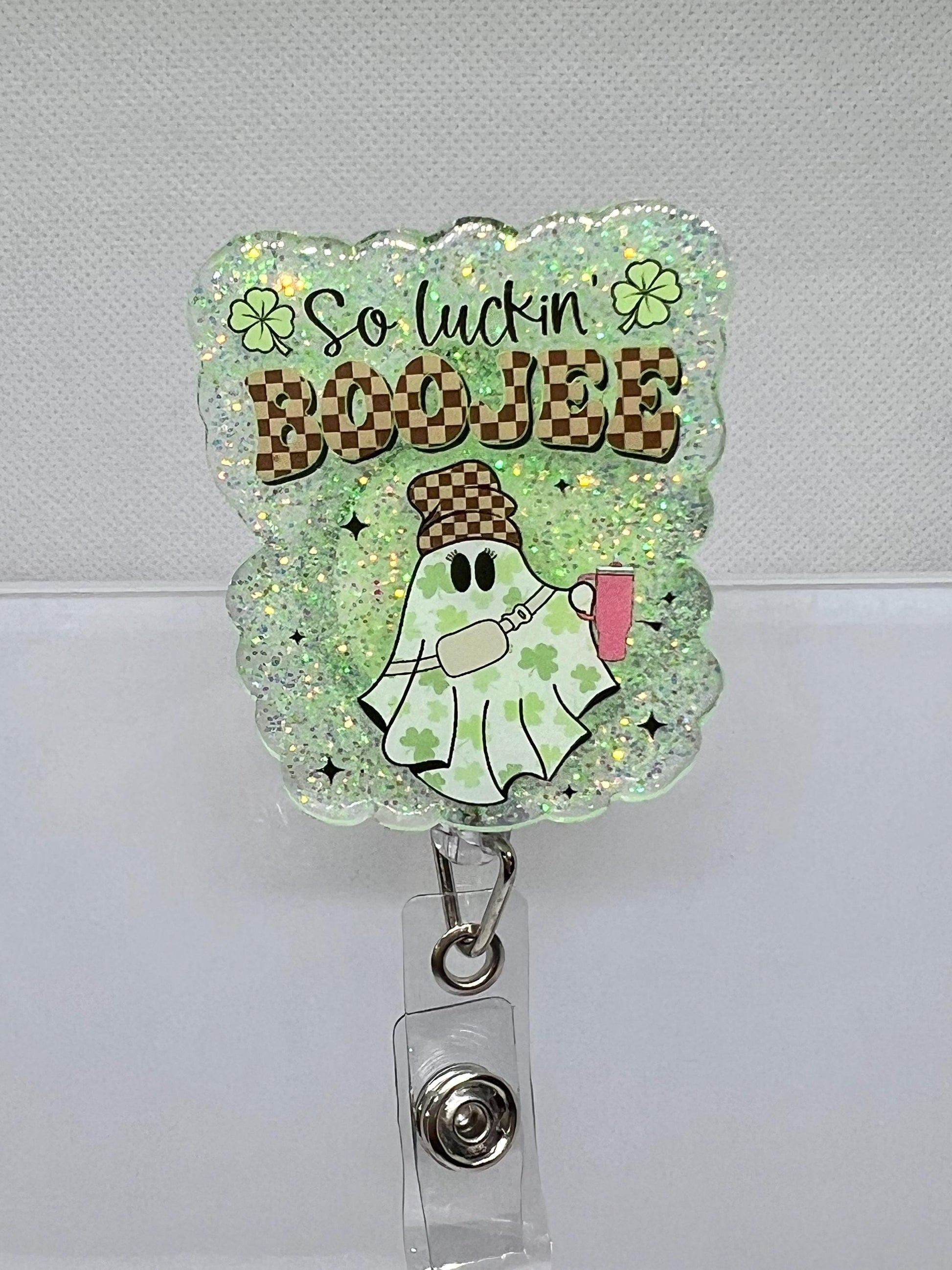 St. Patrick Ghost So Luckin Boojee Acrylic Blank UVDTF Decal Set, Diy Badge Reels, UVDTF sticker, Unfinished Badge Reel, Badge Reel Blanks