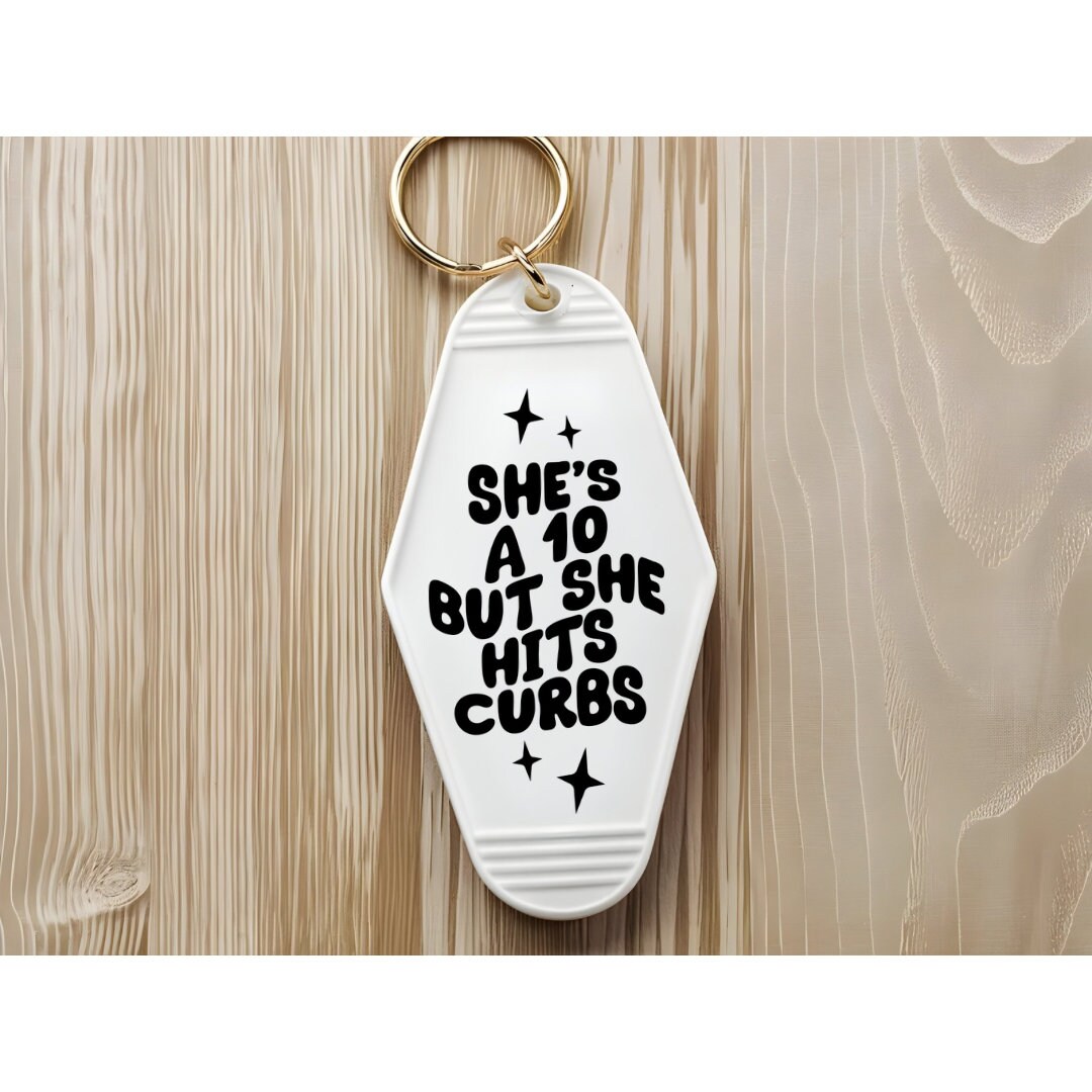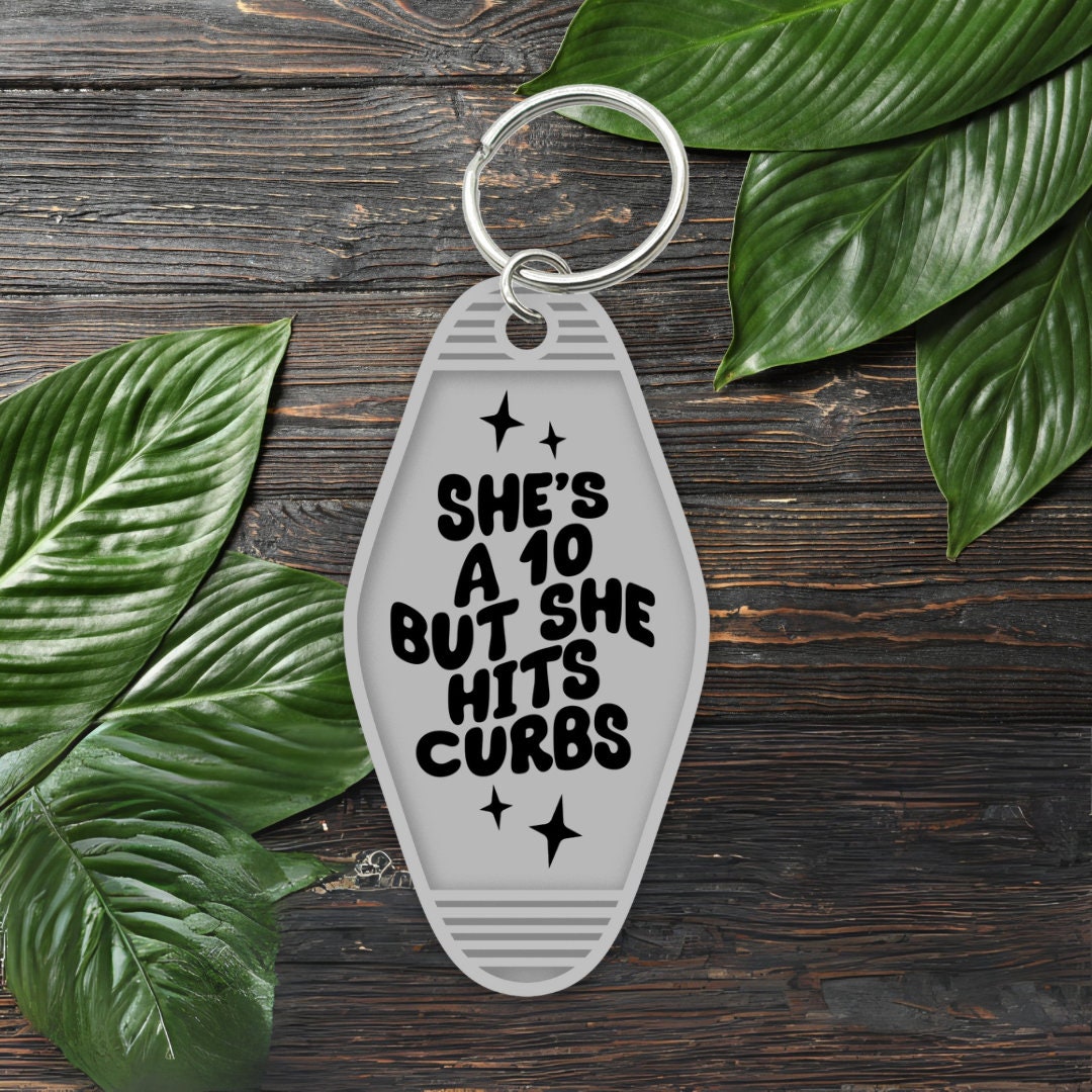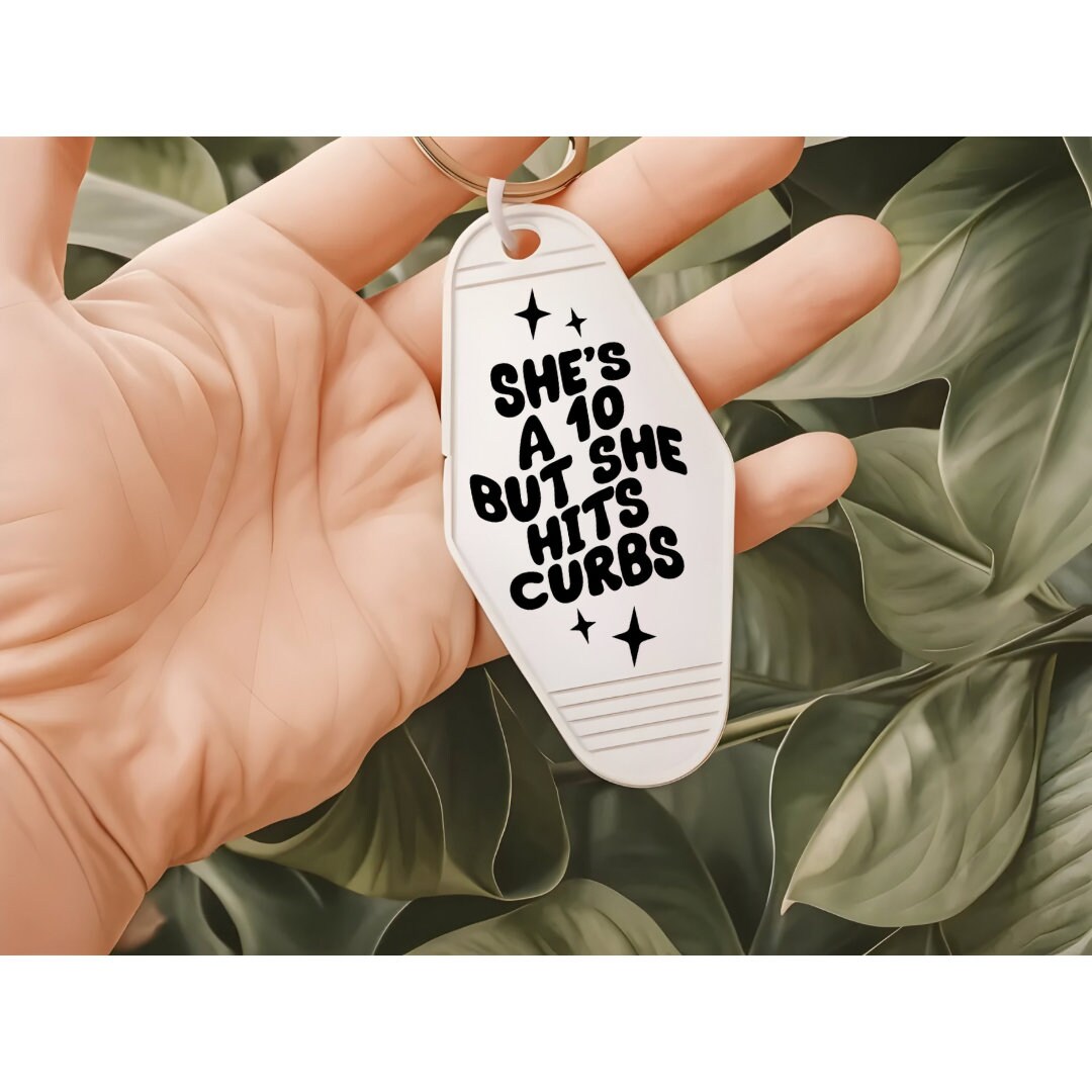 UVDTF Decal Motel She’s a 10 But She Hits Curbs , Funny Decal, Ready to Apply, Permanent Adhesive,Single/Set of 5 Keychain Decals