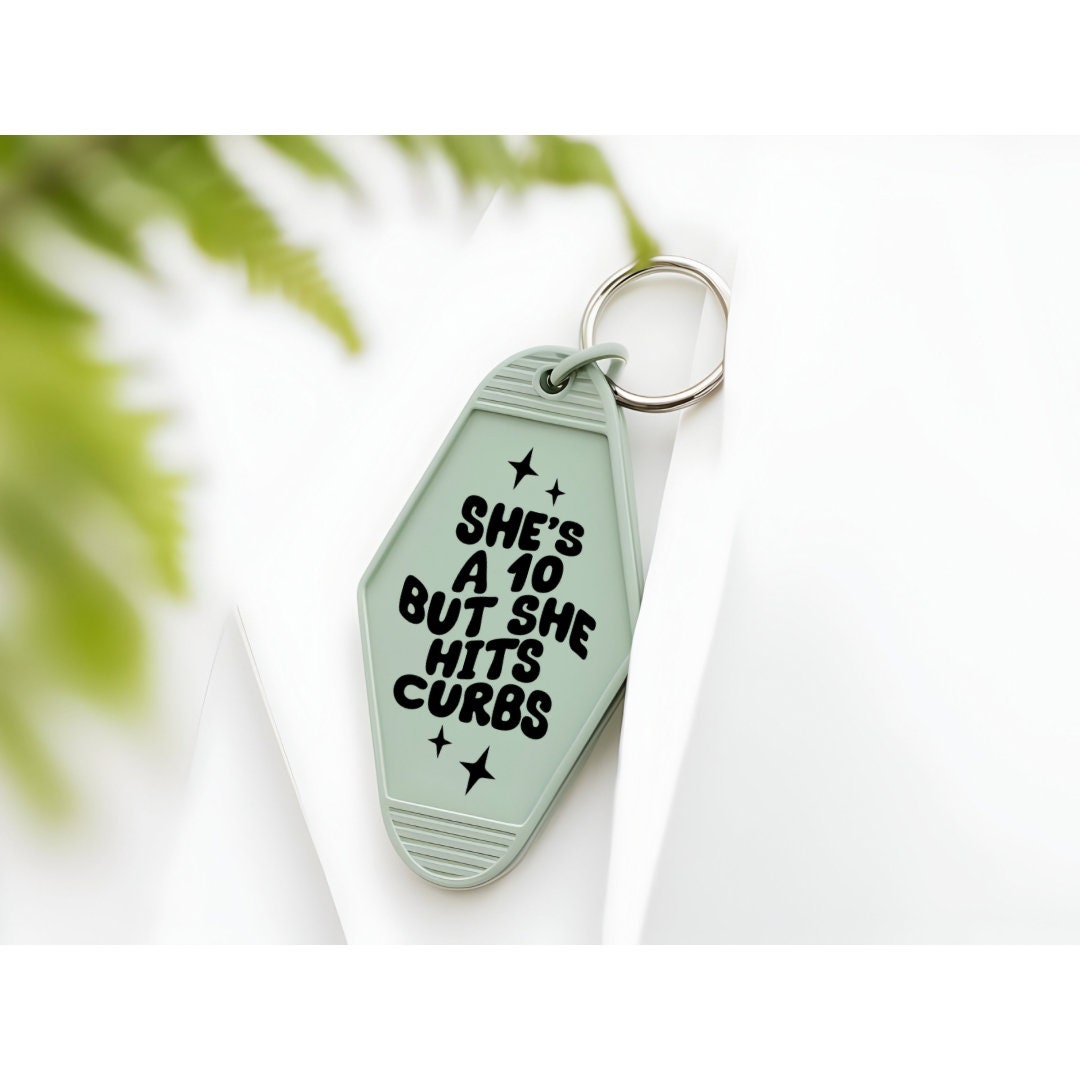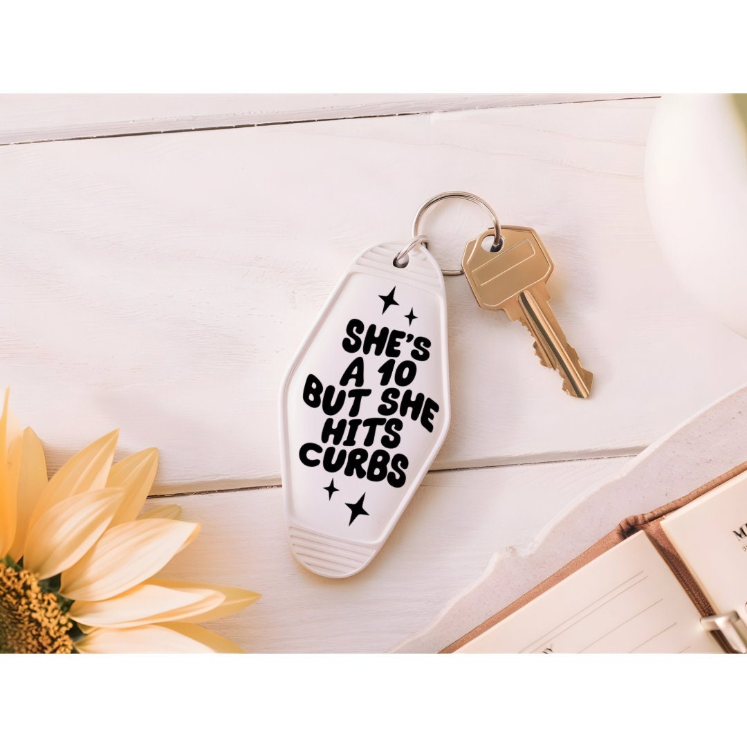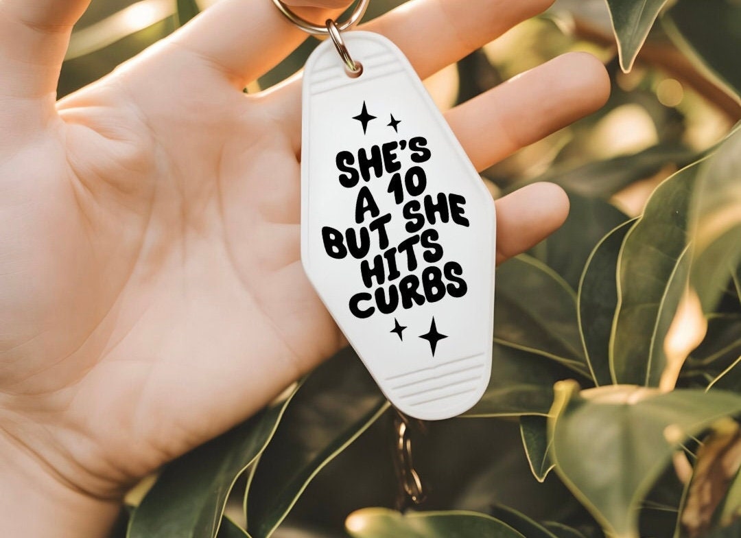 UVDTF Decal Motel She’s a 10 But She Hits Curbs , Funny Decal, Ready to Apply, Permanent Adhesive,Single/Set of 5 Keychain Decals