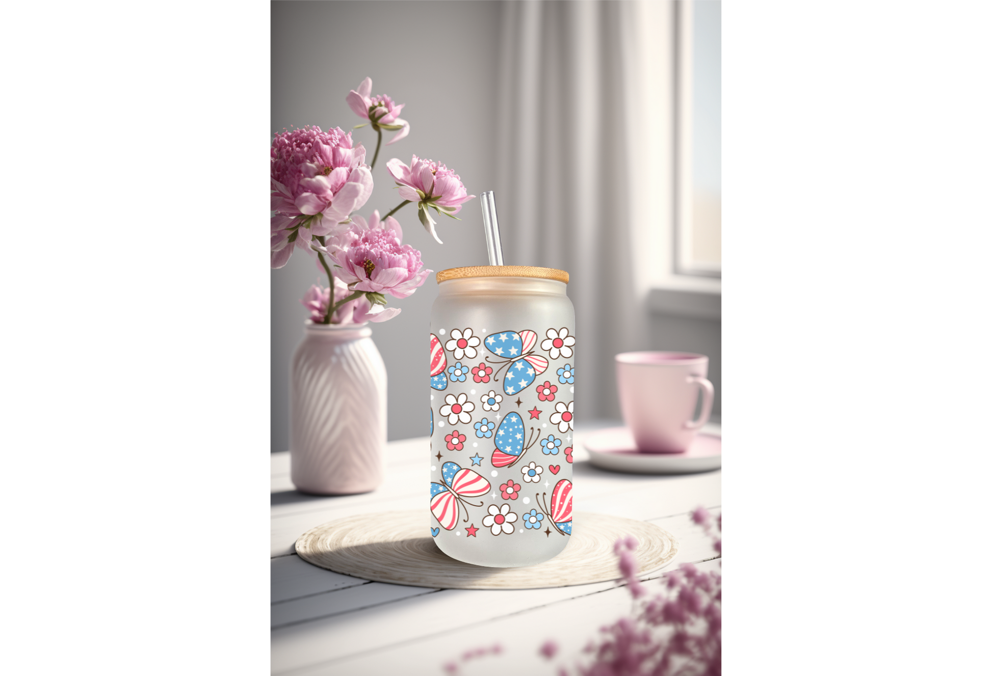 UVDTF Wrap Patriotic Butterfly 16oz Can Glass Mug Tumbler, Ready to apply, Permanent Waterproof Adhesive