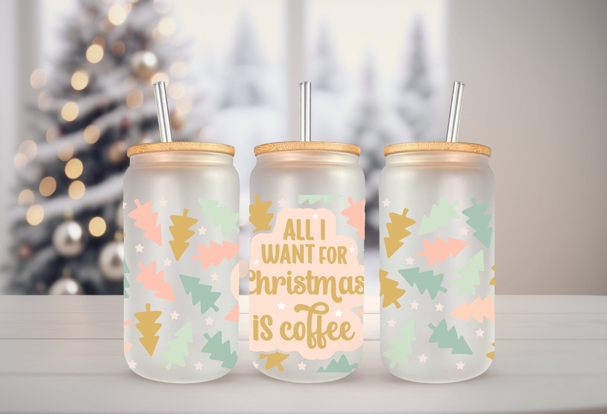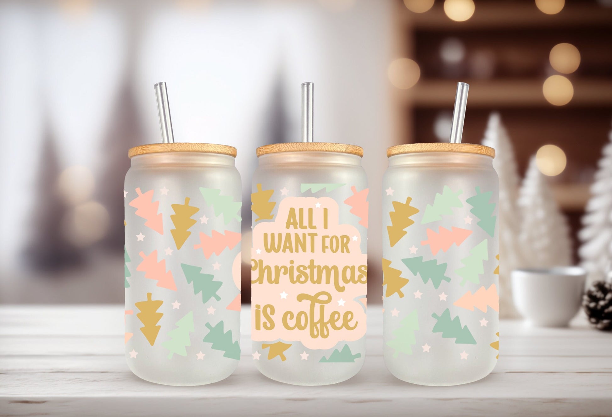 UVDTF Wrap All I Want for Christmas is Coffee for 16oz Can Glass, Mug, Tumbler, Ready to Apply, Permanent Waterproof Adhesive