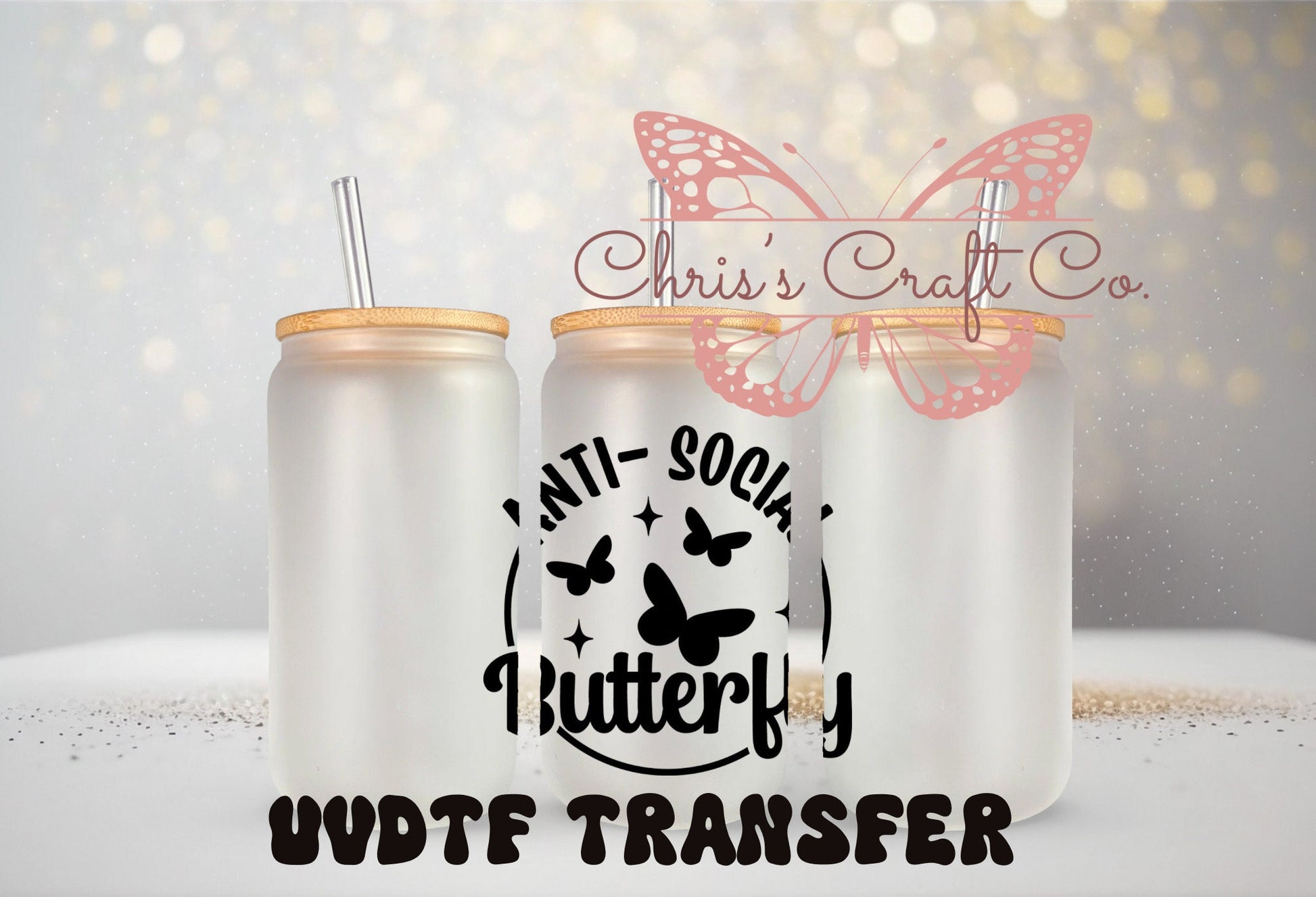 UVDTF Decal Anti Social Butterfly 16oz Can Glass Mug Tumbler, Sarcastic Wrap, Ready to apply, Permanent Adhesive Waterproof, Bundle and Save This listing is for one (1) adhesive cup wrap/decal. Glass is not included. Add a UVDTF wrap to blank 16 oz Can Glass. Link here https://chrisscraftycorner.etsy.com/listing/1621381341 SIZE 9.5” wide x 4" TALL Application Instructions DO NOT USE ALCOHOL TO CLEAN CUP! 1. Peel backing on right or left side creasing it to stay. 2. Place the transfer on the cup ensuring design is straight and positioned correctly. (Once transfer is on the glass it cannot be taken off so please make sure you are positioning your transfer correctly) 3. Press the transfer down, working from right to left or vise versus, pushing out any bubbles. 4. Rub all over the design with your fingers. The more rubbing the better. 5. Peel clear film off slowly and you're done! Hand wash only please We are not responsible for application mishaps. *Please note: Not all brands of 16 oz. glass cups have the exact same measurements. They can differ by a couple of millimeters. Our wraps have been measured to fit Libbey glass cans. Adjustments may be necessary*