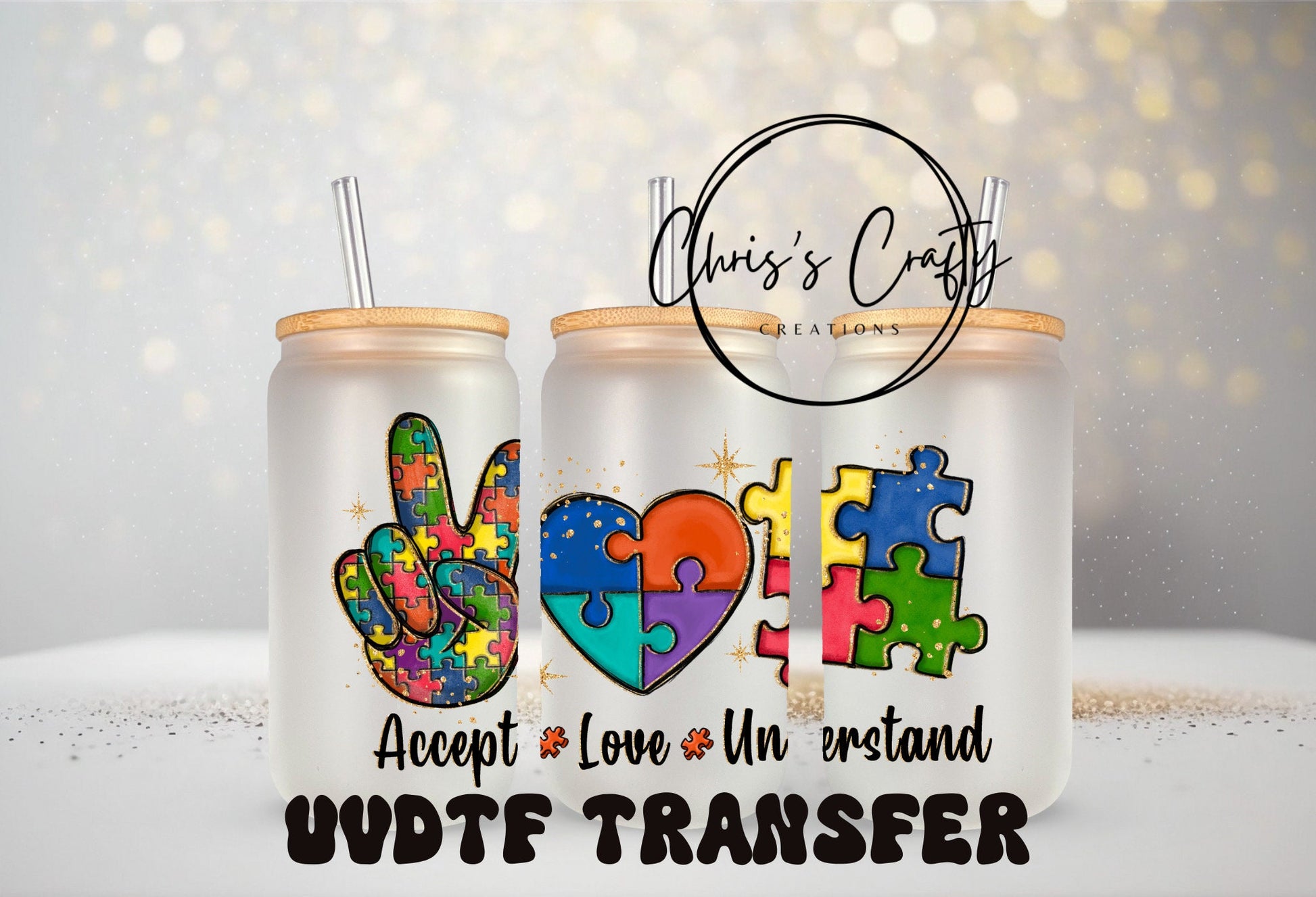 UVDTF Wrap Autism Awareness Peace Love Understand 16oz Can Glass Mug Tumbler, Autism Wrap, Ready to apply, Permanent Waterproof Adhesive