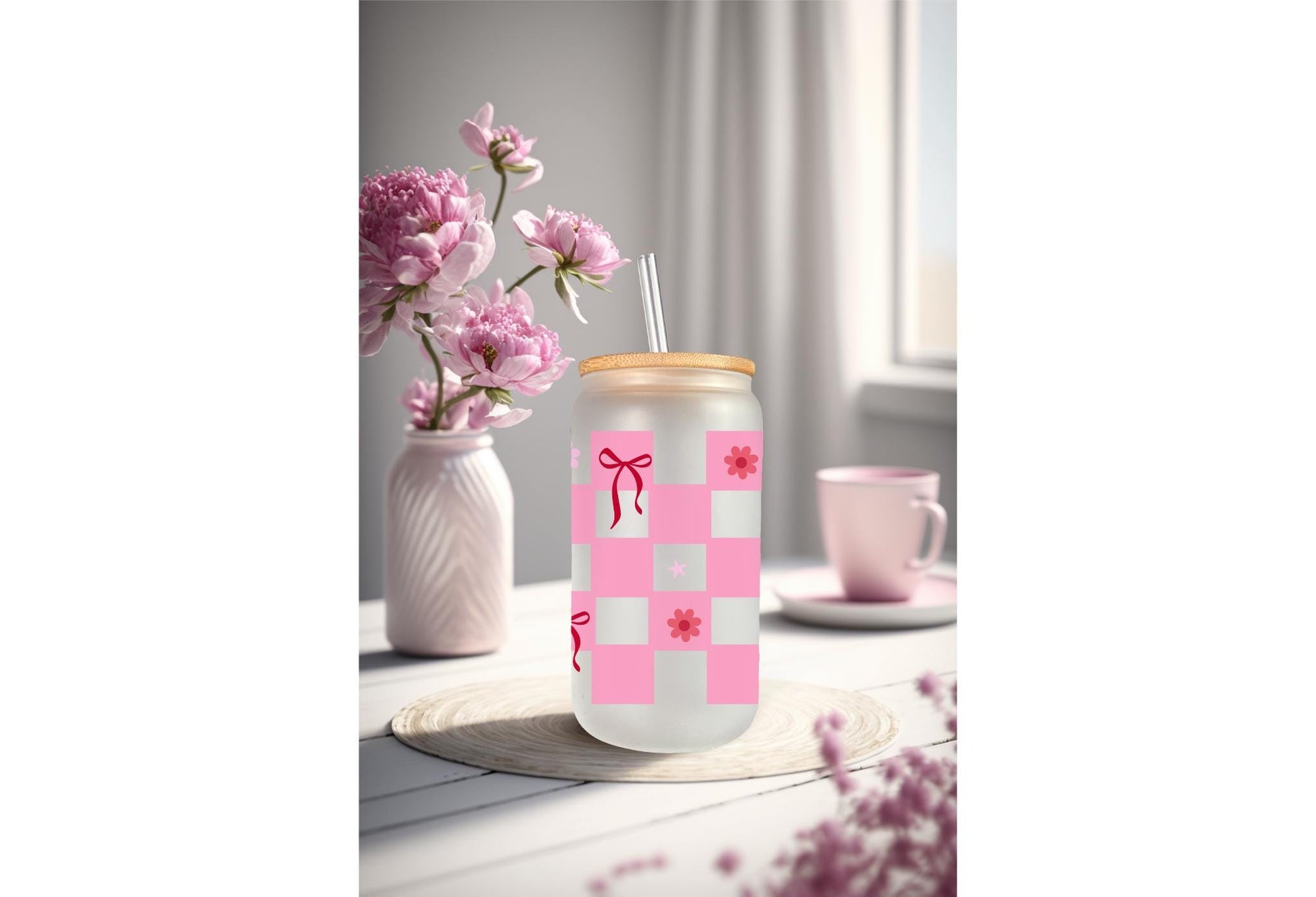 UVDTF Wrap Coquette Bows Checkered Dark Pink 16oz Can Glass Wrap Mug Tumbler, Ready to Apply, Permanent Waterproof Adhesive