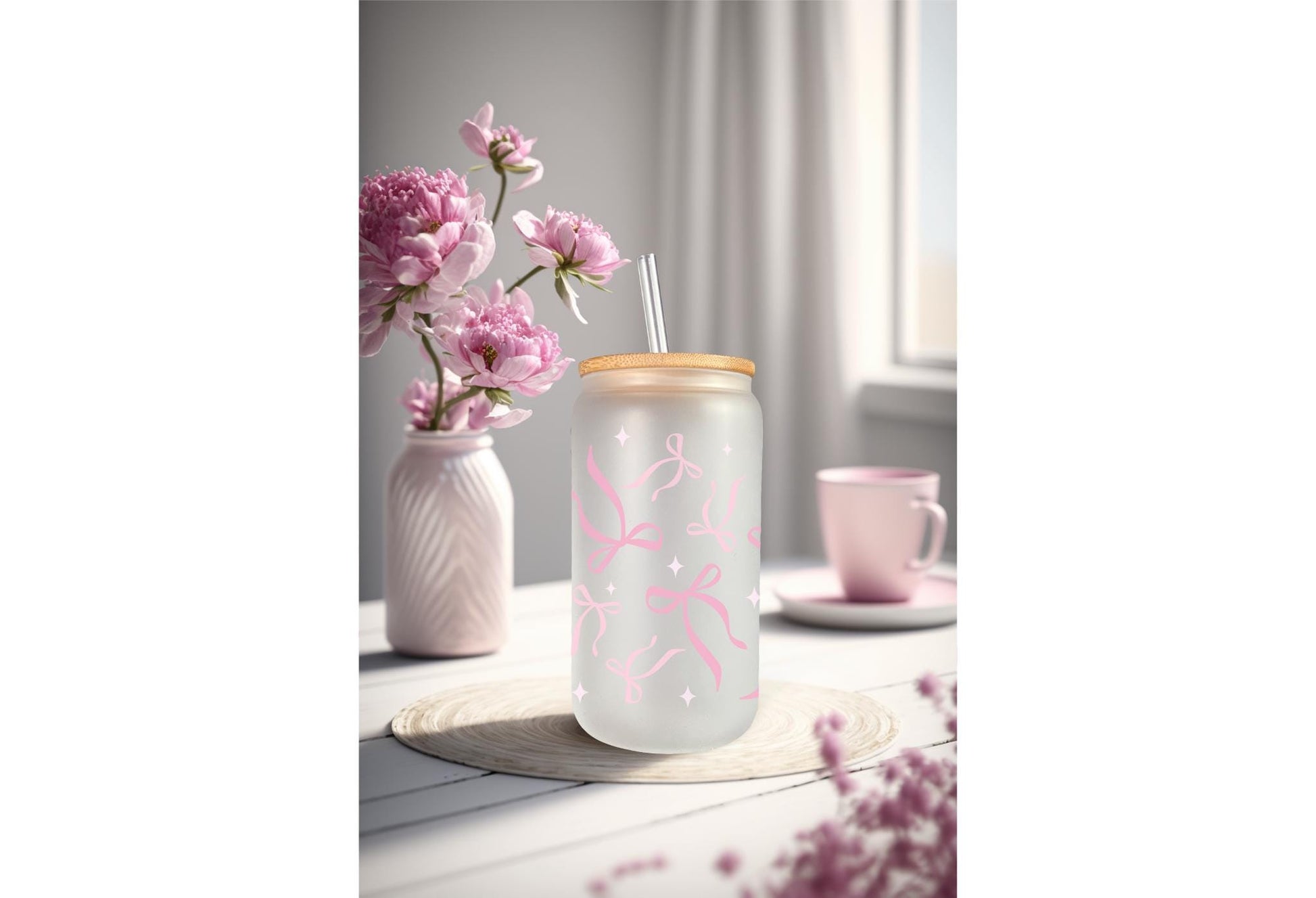 Elevate your drinking experience with our UVDTF Wrap Coquette Bows Light Pink 16oz Can Glass Wrap Mug Tumbler. This unique product allows you to effortlessly decorate your cups with its ready-to-apply, permanent, and waterproof adhesive. Say goodbye to boring cups and hello to a charming touch that will surely impress your guests.