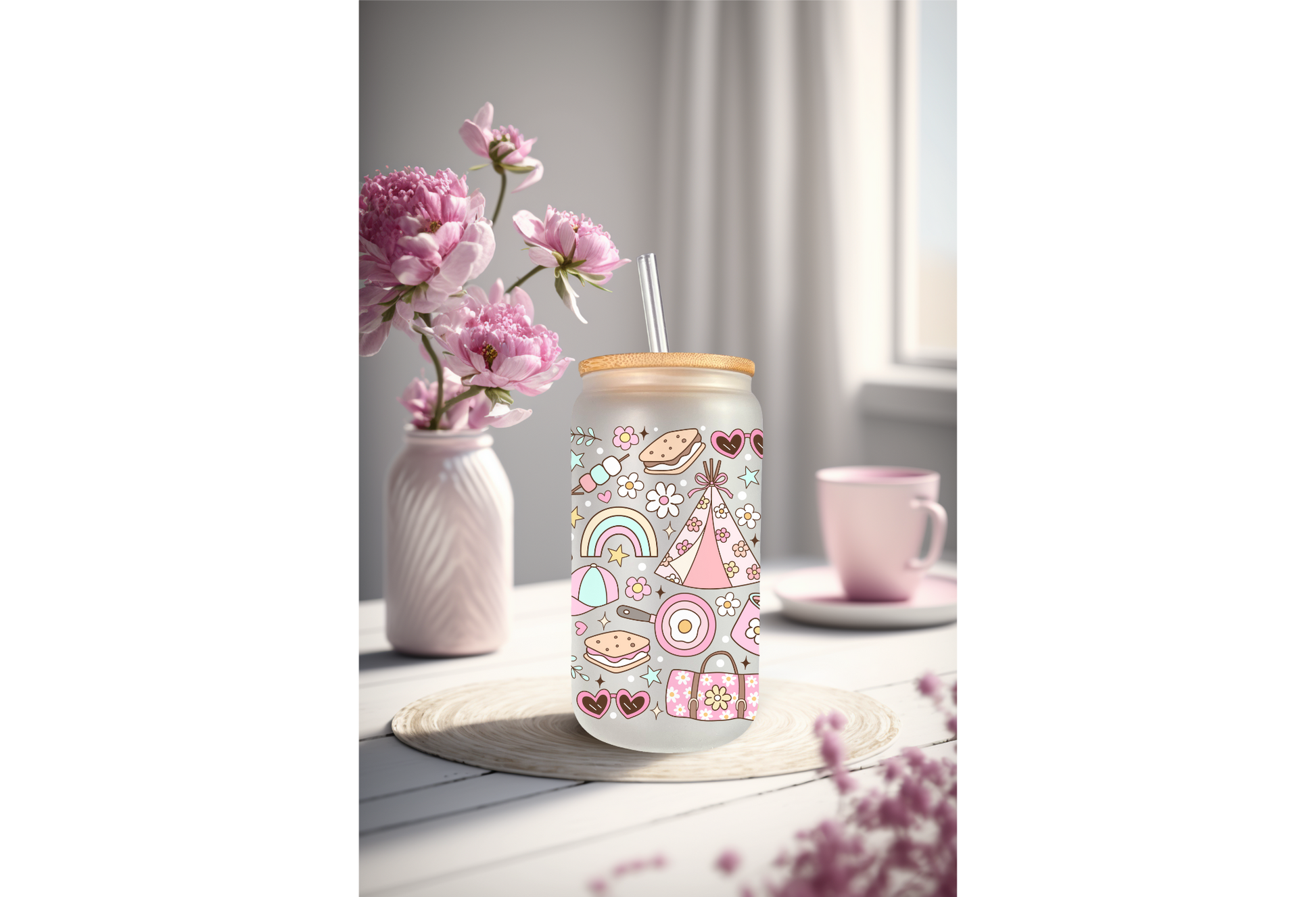 UVDTF Wrap Girly Camp 16oz Can Glass Mug Tumbler, Ready to apply, Camp Wrap, Permanent Waterproof Adhesive