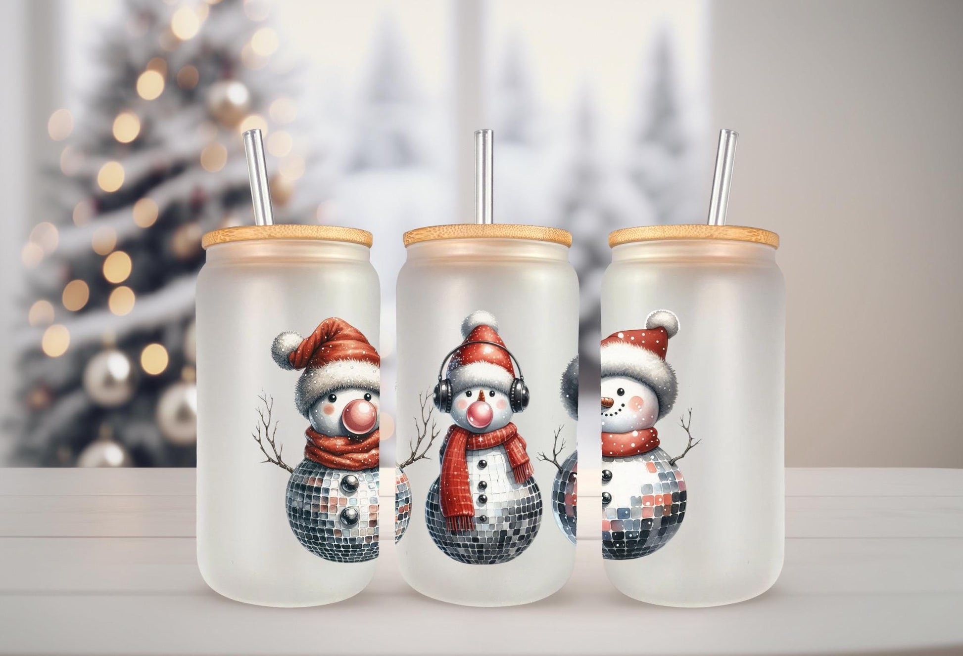 UVDTF Wrap Disco Snowmen 16oz Can Glass Mug Tumbler, Ready to apply, Permanent Waterproof Adhesive