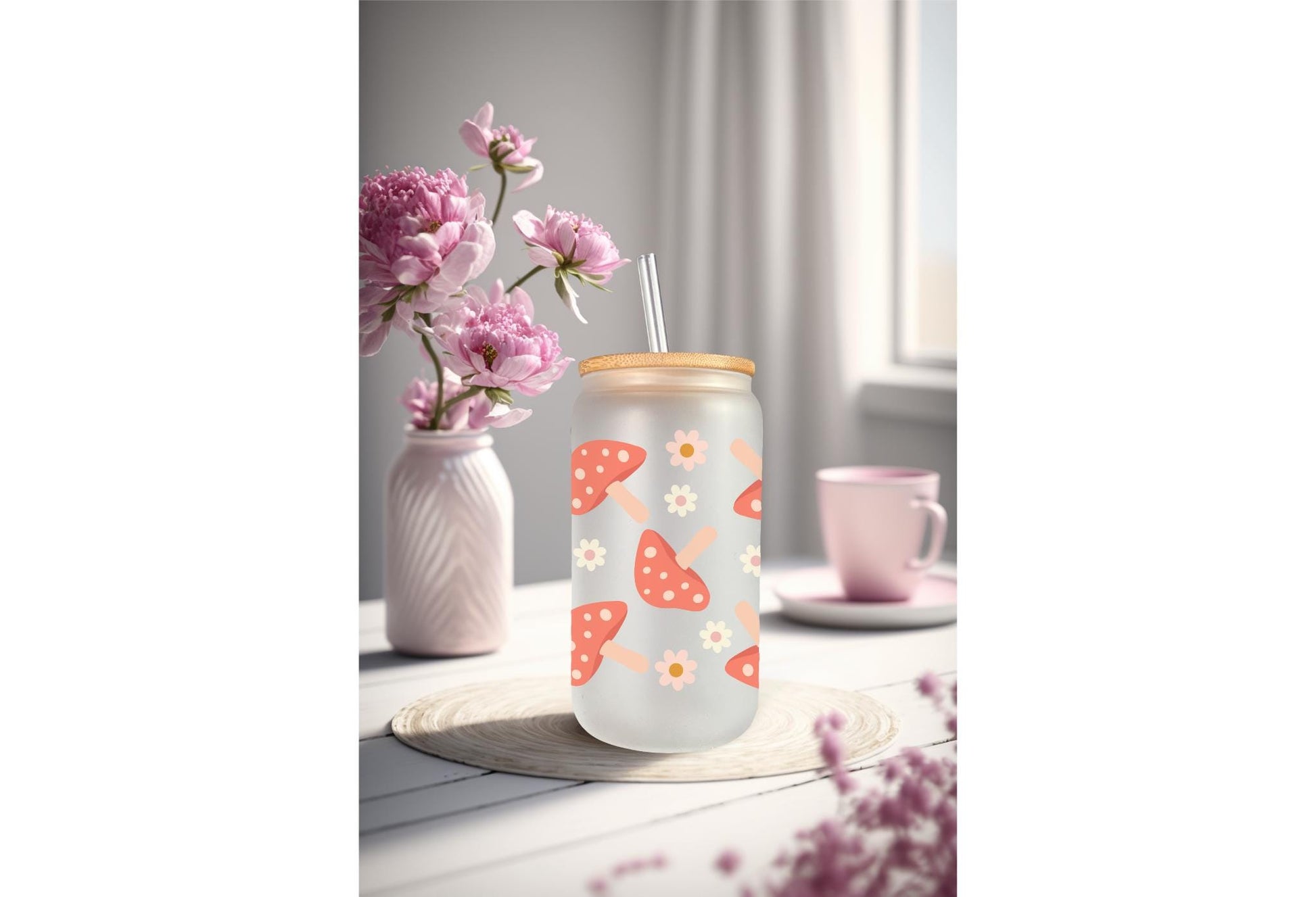 UVDTF Wrap Floral Mushrooms 16oz Can Glass Mug Tumbler, Ready to Apply, Permanent Waterproof Adhesive