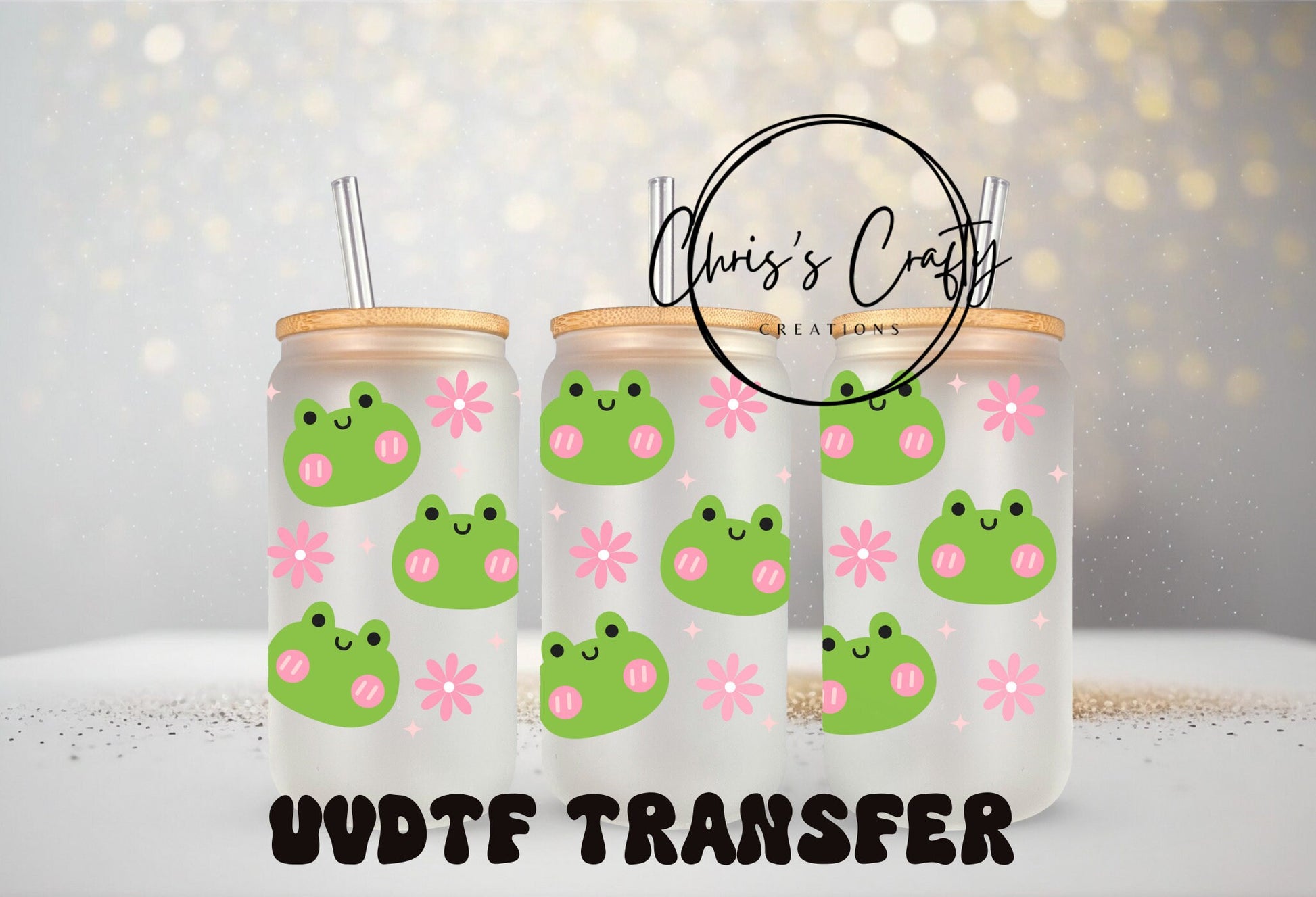 UVDTF Wrap for Cute Frogs Pink Flowers 16 oz Can Glass, Frog Wrap, Ready to apply, Permanent Waterproof Adhesive