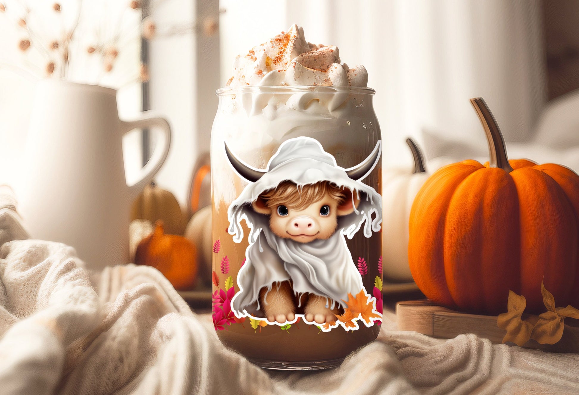 UVDTF Wrap Ghost Cow Floral 16oz Can Glass, Mug, Tumbler, Halloween Wrap, Double Sided Print Option, Ready to Apply, Permanent Adhesive