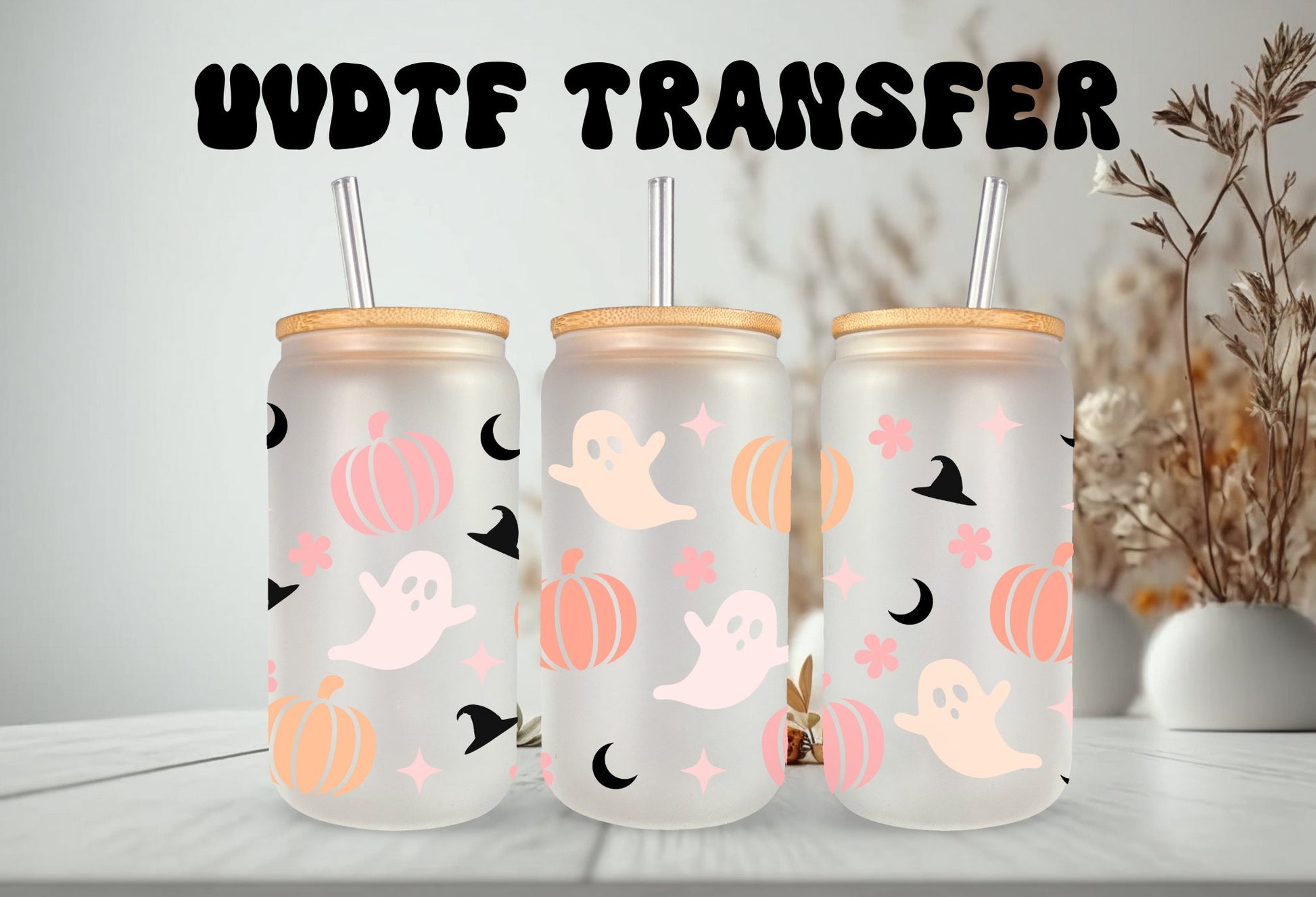 UVDTF Wrap Ghost Pumpkin Witch Hat Halloween 16 oz Can Glass, Mug, 40 oz Wrap, Ready to apply, Permanent Waterproof Adhesive