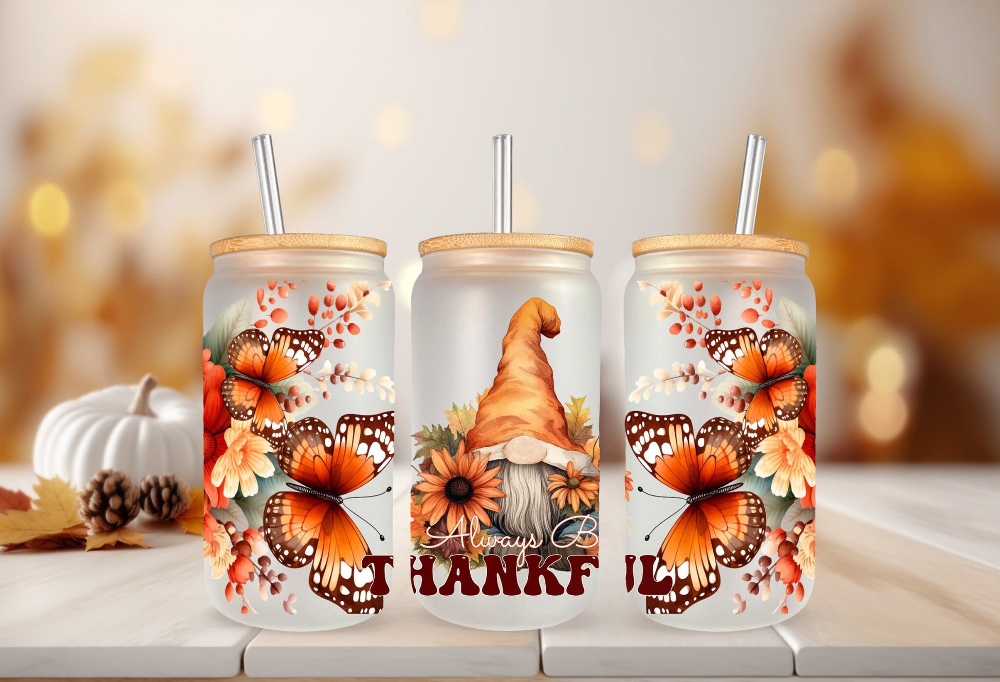UVDTF Wrap Gnomes Always Be Thankful Floral Butterfly 16oz Can Glass, Mug, 40oz Tumbler, Fall Wrap, Ready to apply, Permanent Adhesive