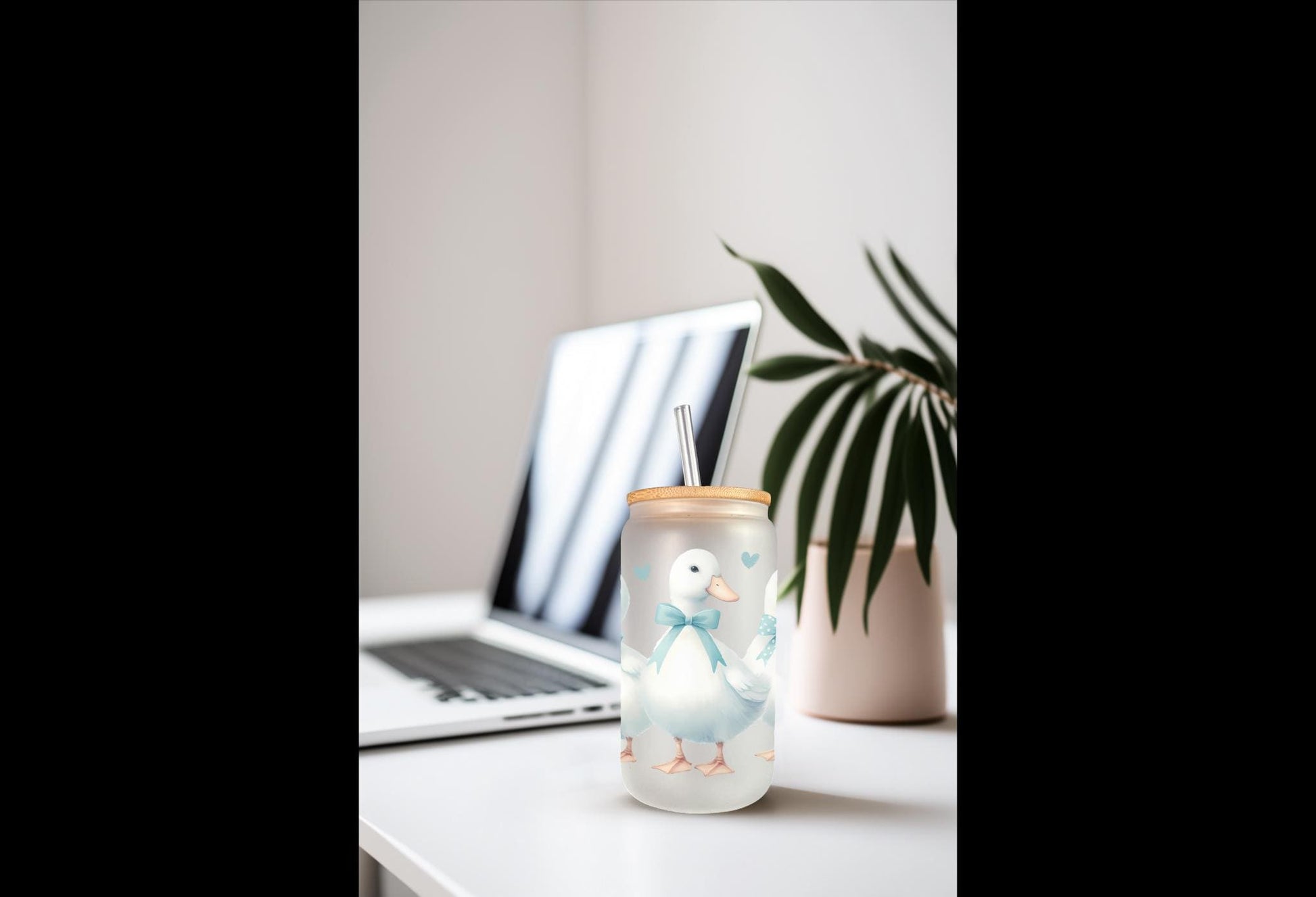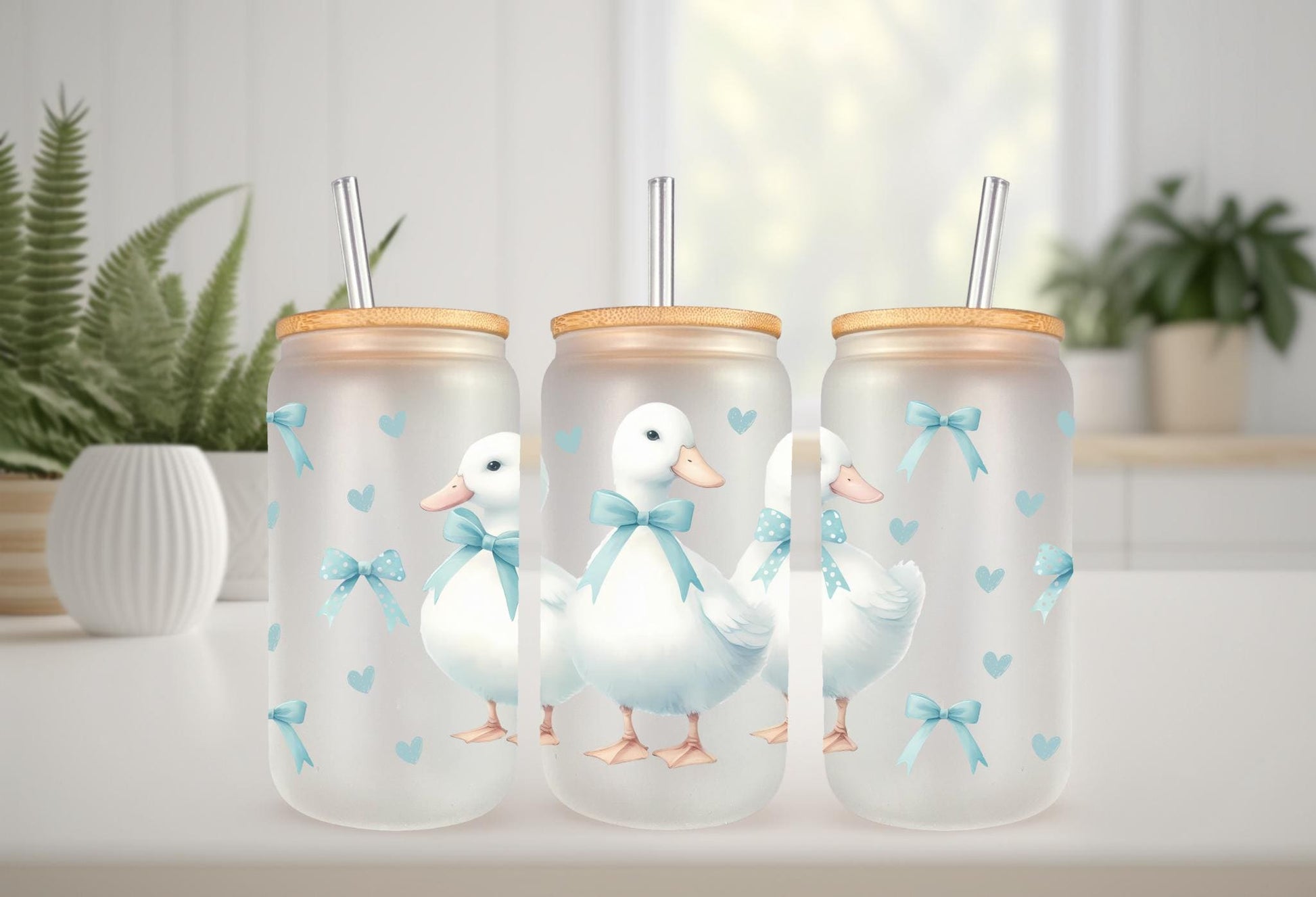 UVDTF Wrap Goose Blue Bows 16oz Can Glass Mug Tumbler, Ready to apply, Permanent Adhesive, Double sided option