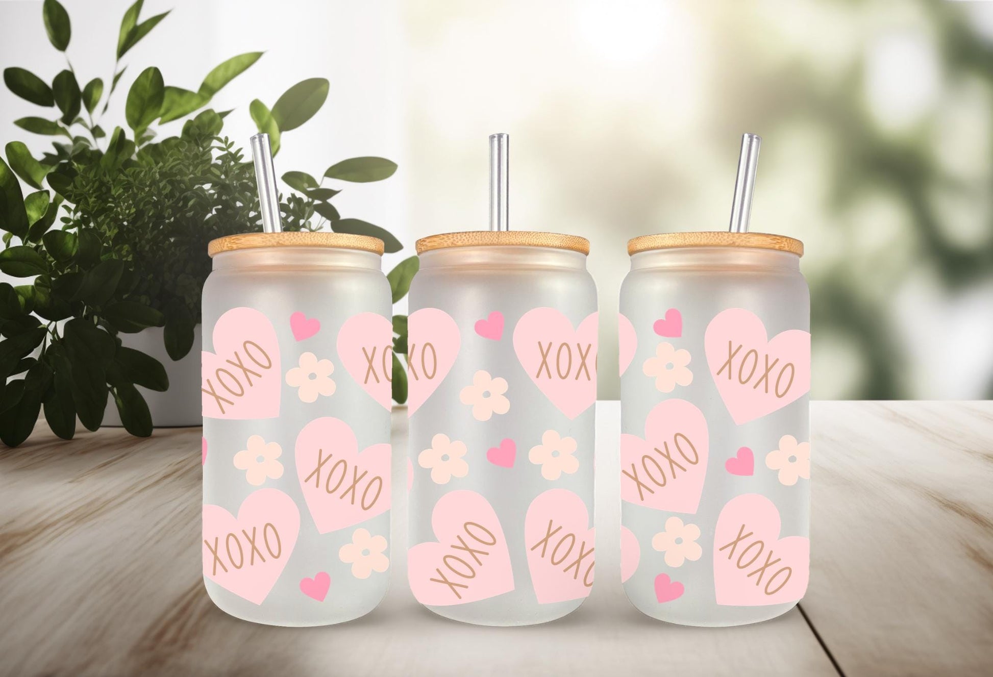 UVDTF Wrap Heart XOXO Valentine’s Floral 16oz Can Glass Mug Tumbler, Ready to Apply, Permanent Waterproof Adhesive