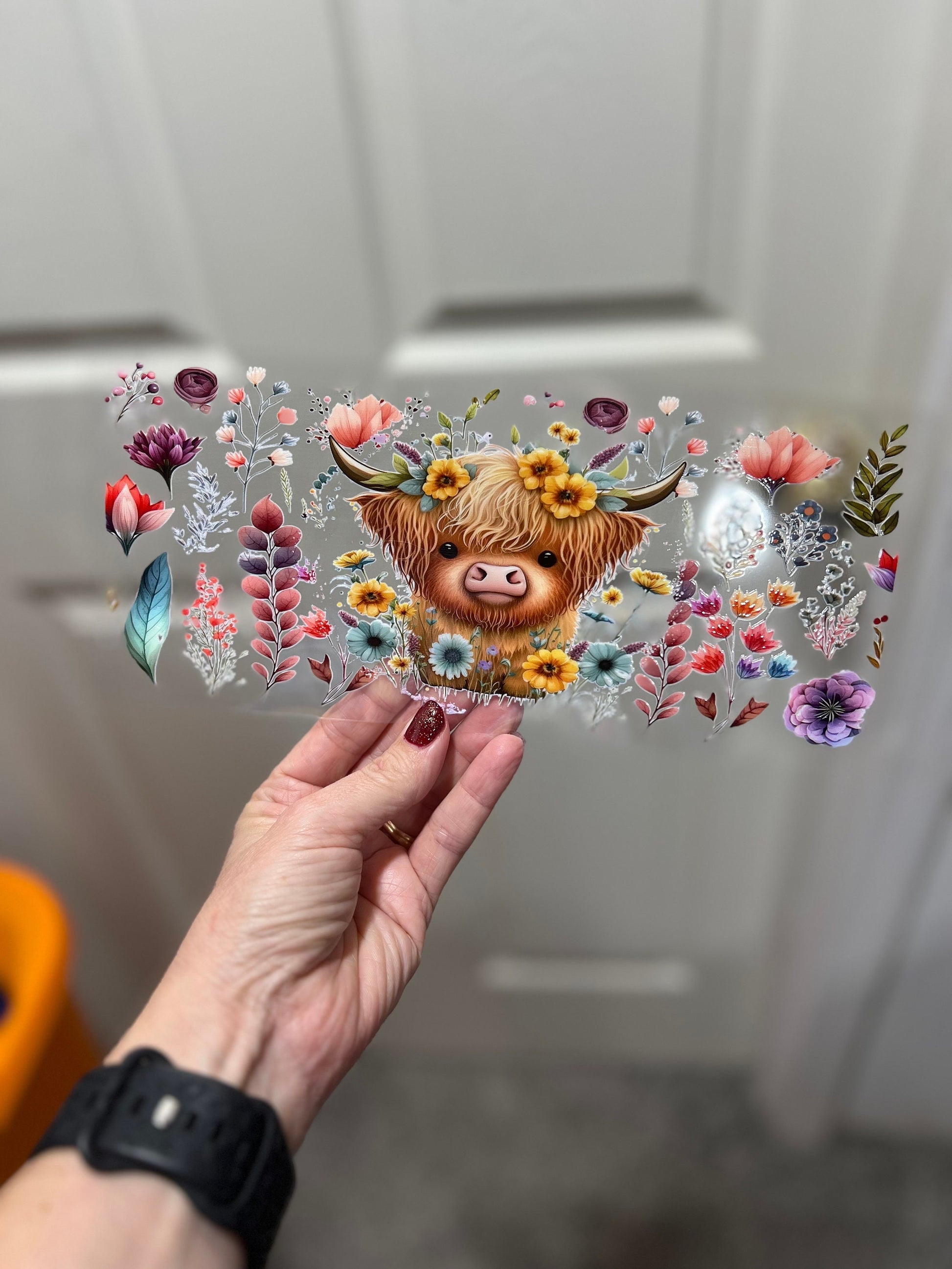 UVDTF Wrap Highland Cow Flowers 16oz Can Glass Mug Tumbler, Ready to Apply, Permanent Waterproof Adhesive