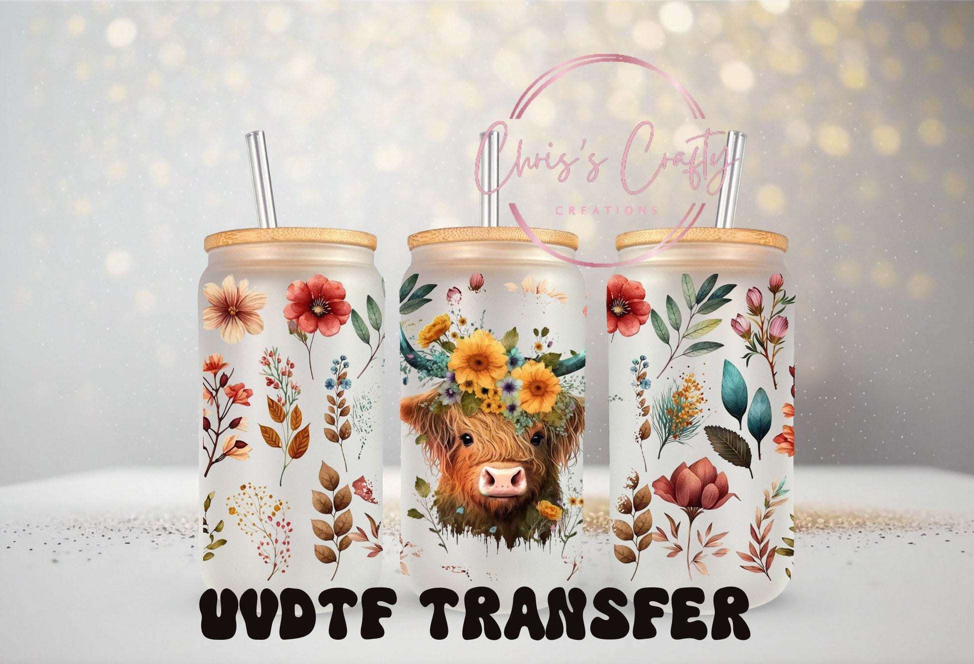 UVDTF Wrap Highland Cow Flowers Burgundy 16oz Can Glass Mug Tumbler, Cow Wrap, Ready to apply, Permanent Waterproof Adhesive