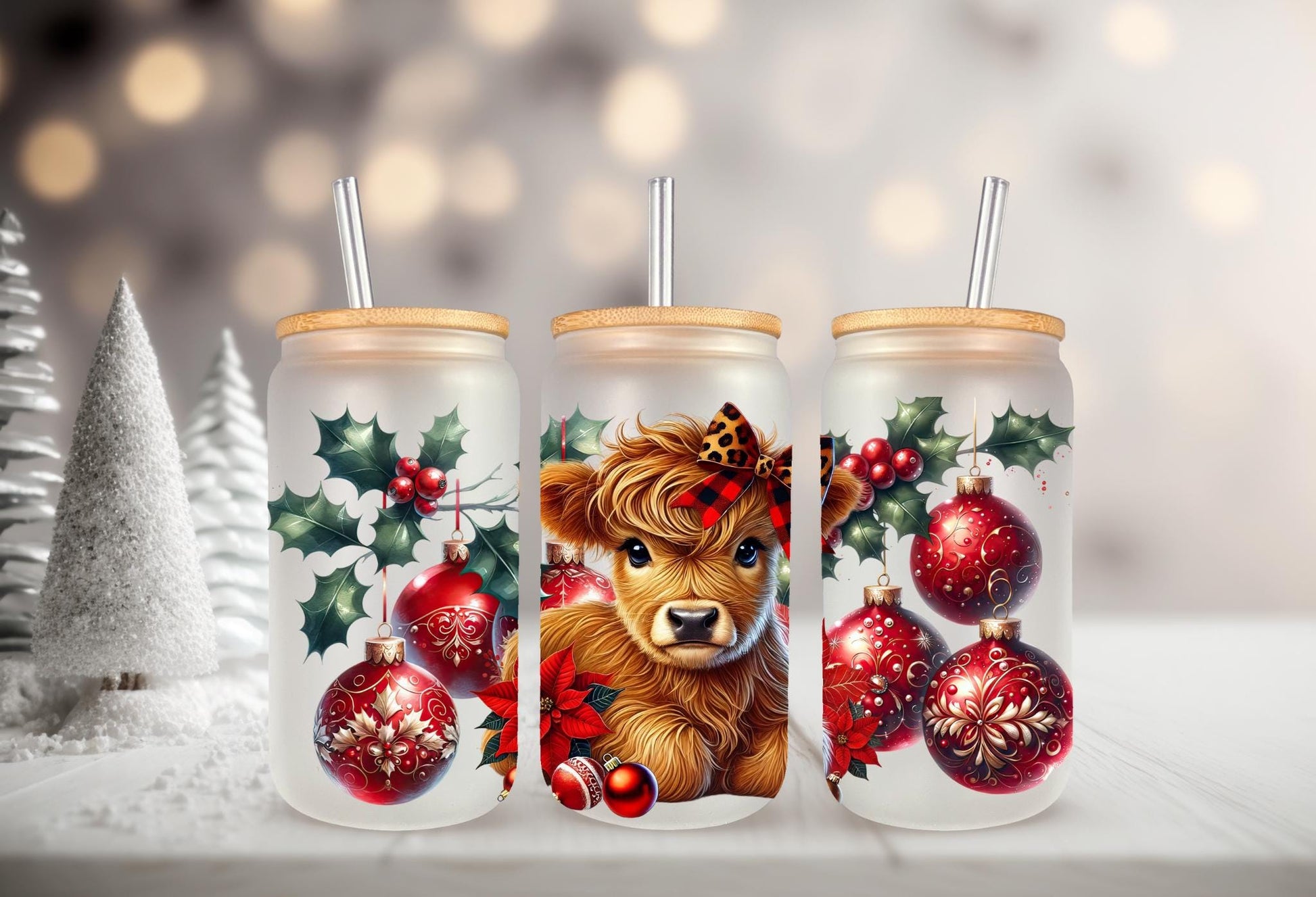 UVDTF Wrap Highland Cow Ornaments Poinsettia 16oz Can Glass Mug Tumbler, Ready to Apply, Permanent Waterproof Adhesive