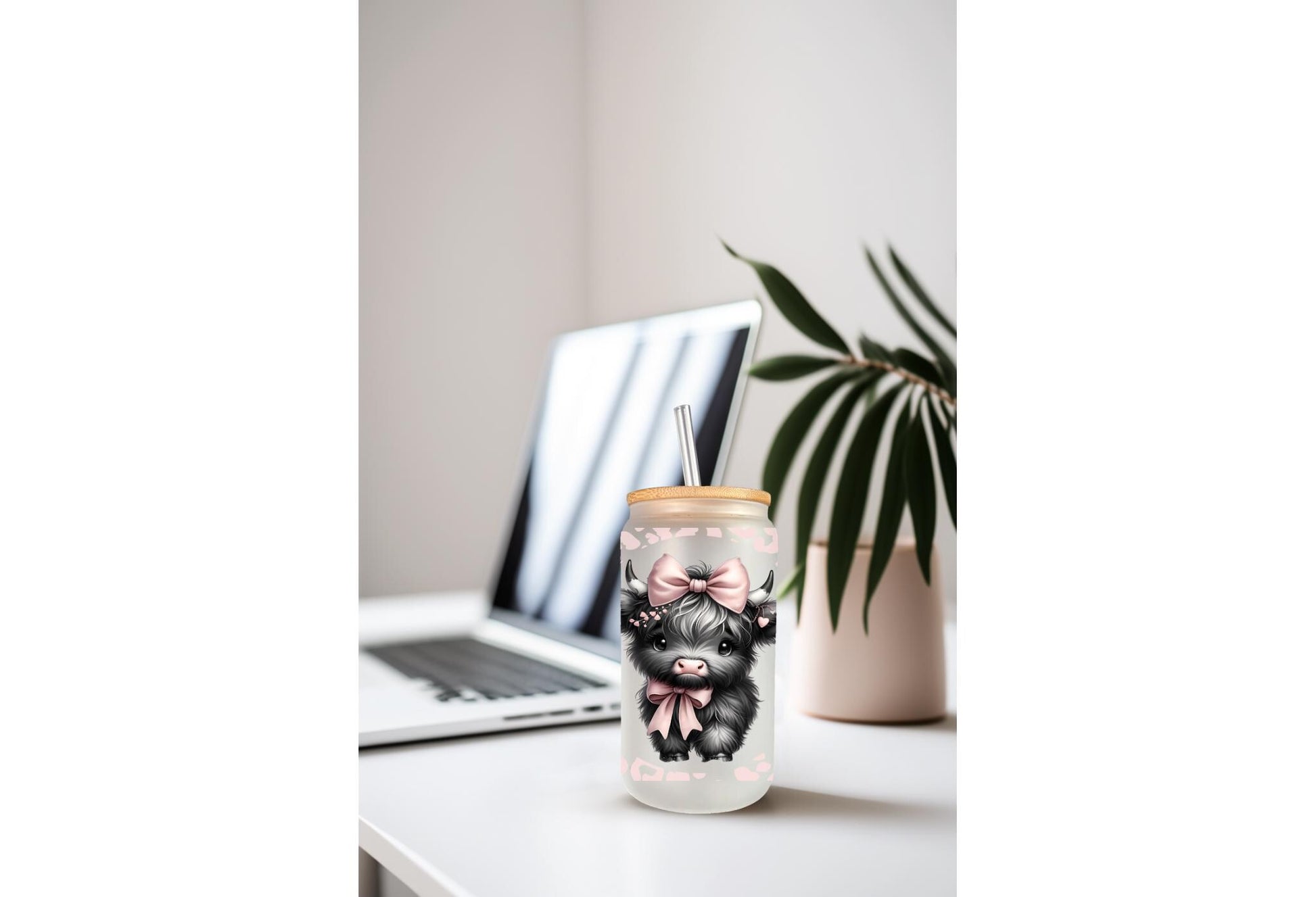 Enhance your cup's aesthetic with our UVDTF Wrap Highland Cow pink Bow Leopard Print 16oz Can Glass Mug Tumbler Wrap. Perfect for a bold and playful touch, these wraps are ready to apply with permanent adhesive. Use it to decorate your cups with ease and create a lasting impression.