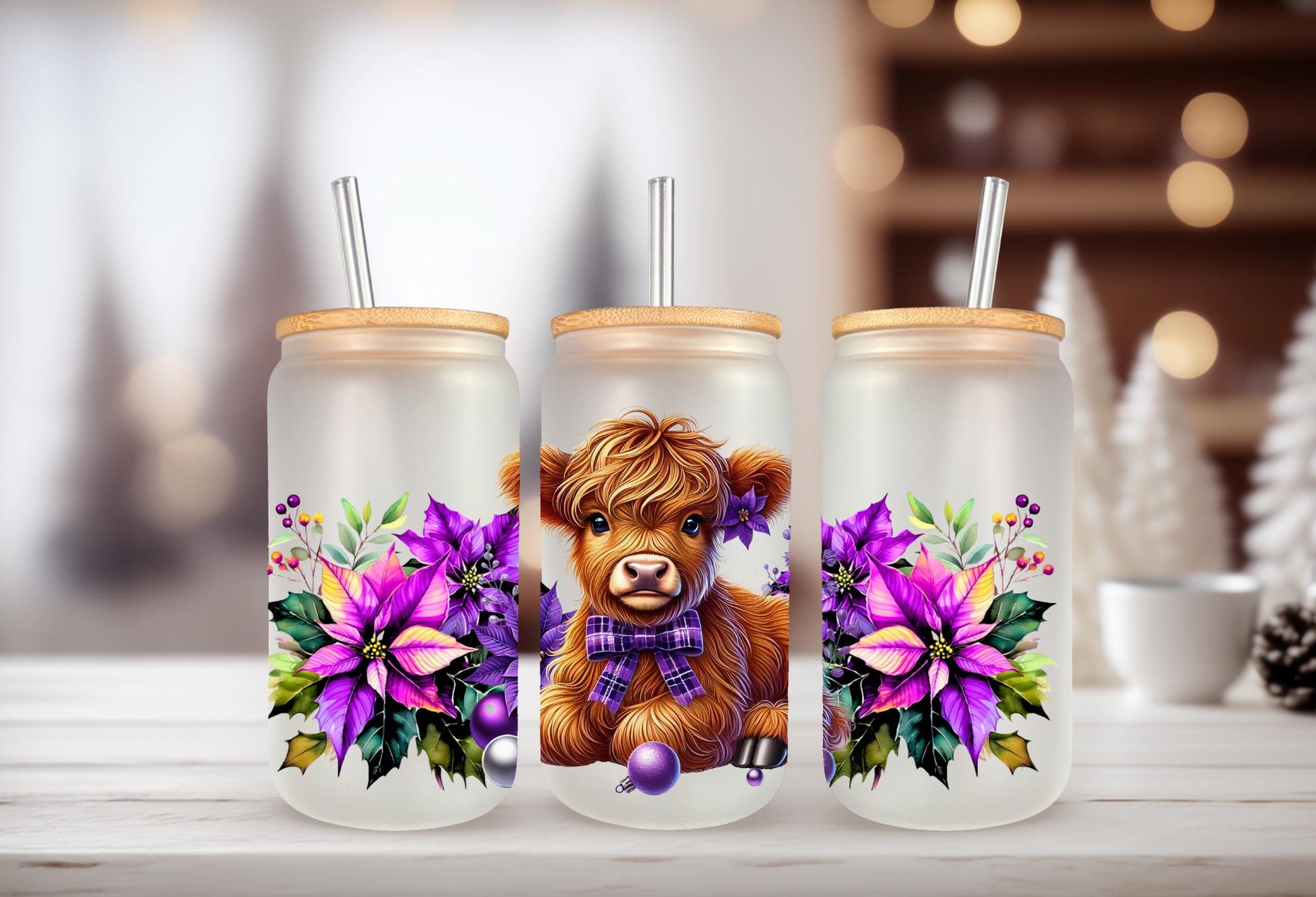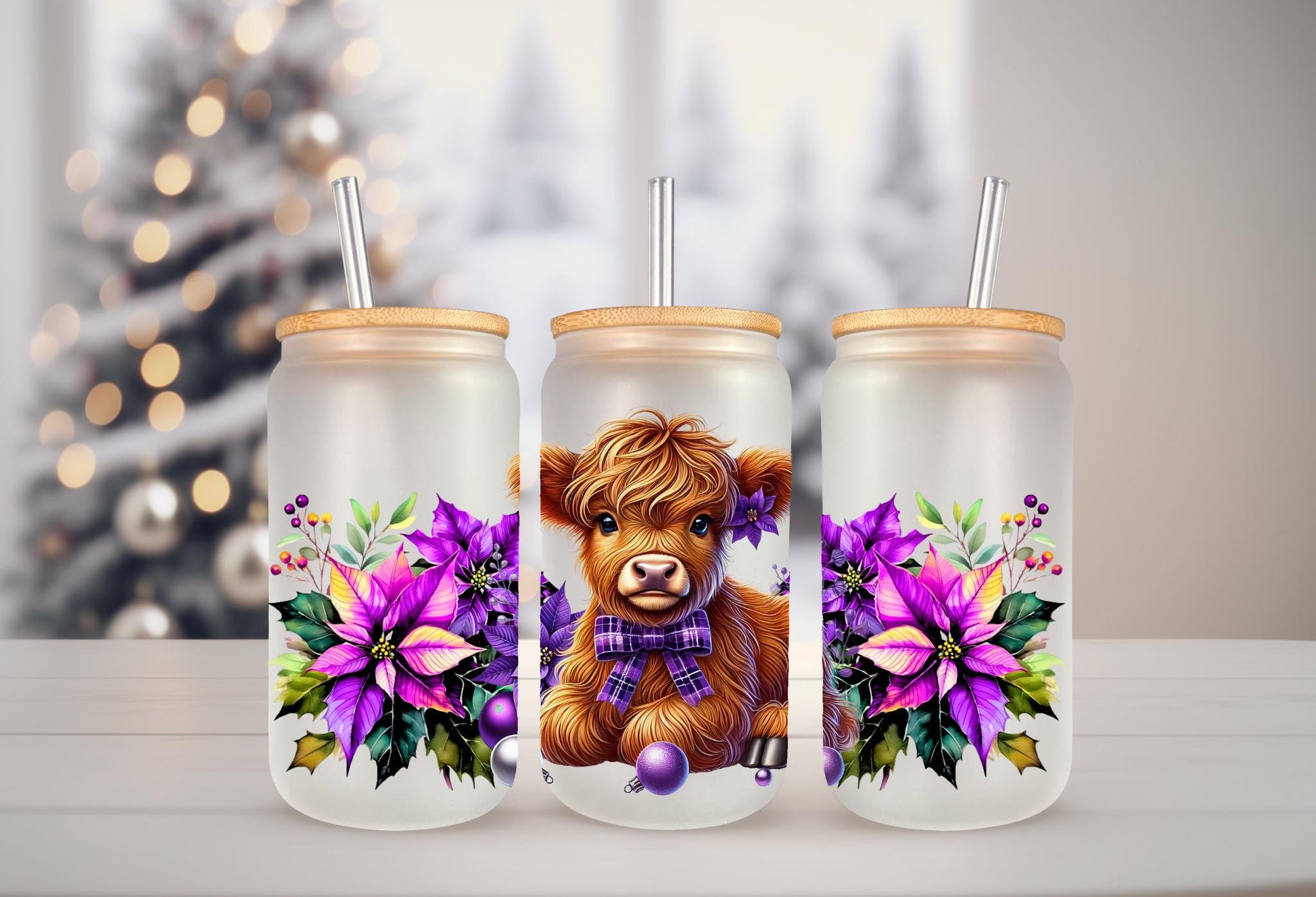 UVDTF Wrap Highland Cow Poinsettias ornaments Purple 16oz Can Glass Mug Tumbler, Ready to Apply, Permanent Adhesive, Double Sided Print