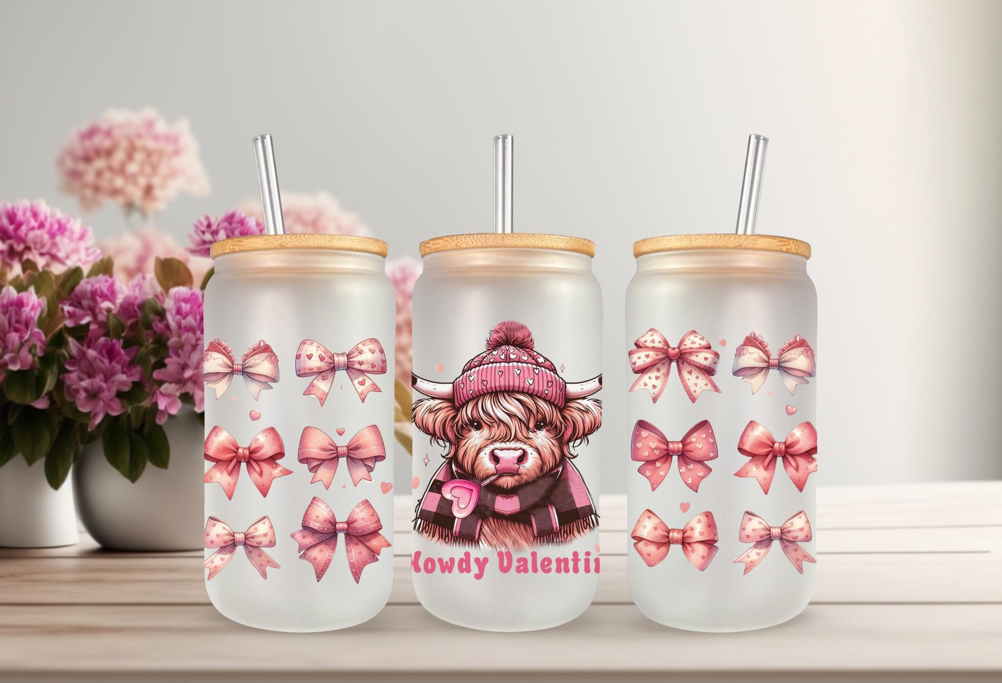 UVDTF Wrap Highland Cow Valentine Howdy 16oz Can Glass Mug Tumbler, Ready to Apply, Permanent Waterproof Adhesive