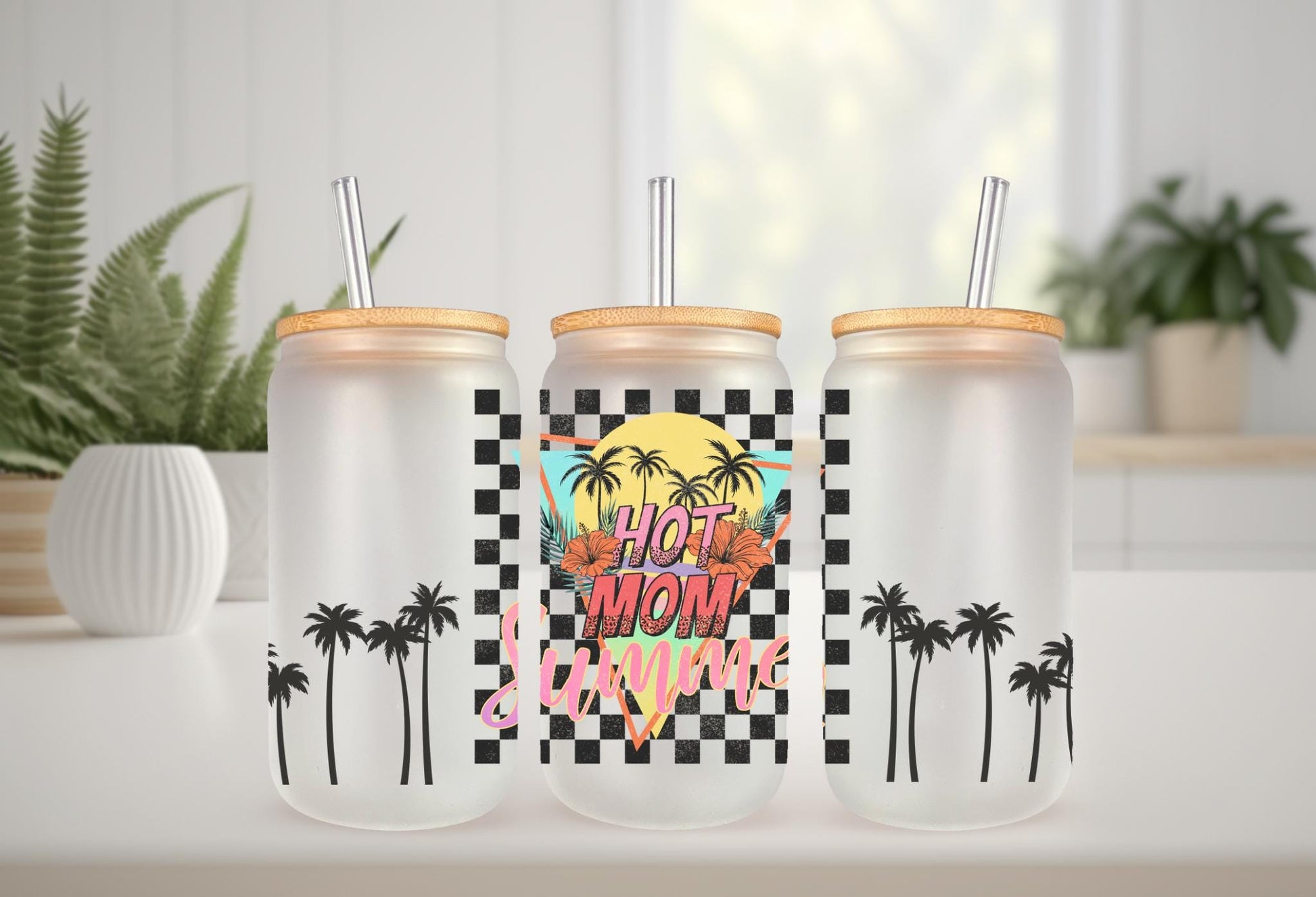 UVDTF Wrap Hot Mom Summer Checkered Palm 16oz Can Glass Mug Tumbler, Ready to apply, Permanent waterproof adhesive