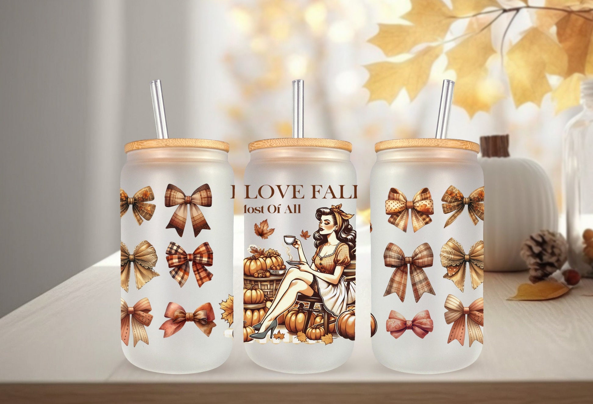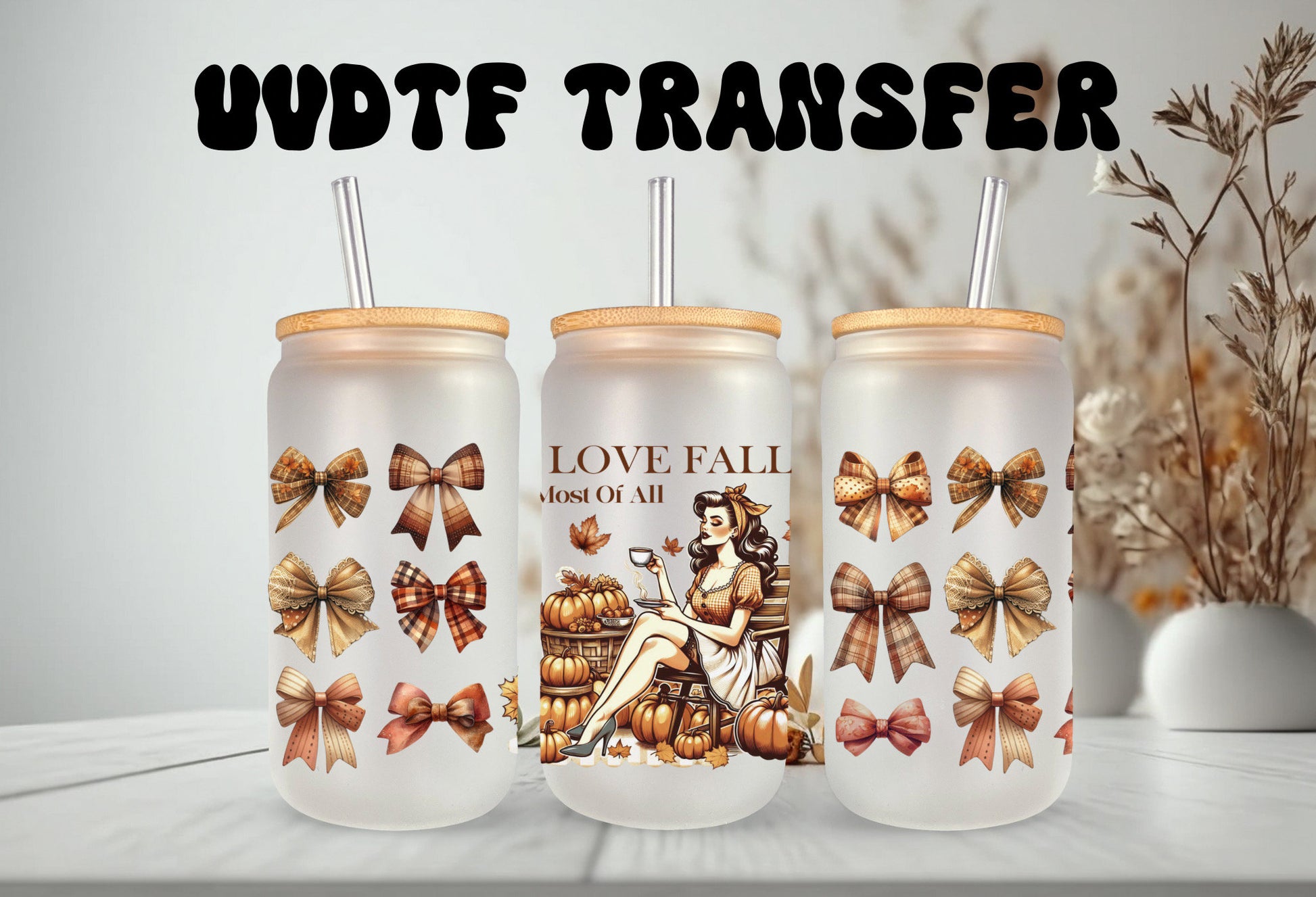 UVDTF Wrap I Love Fall Vintage Girl Coquette Bows for 16oz Can Glass Mug Tumbler, Ready to apply, Permanent Waterproof Adhesive