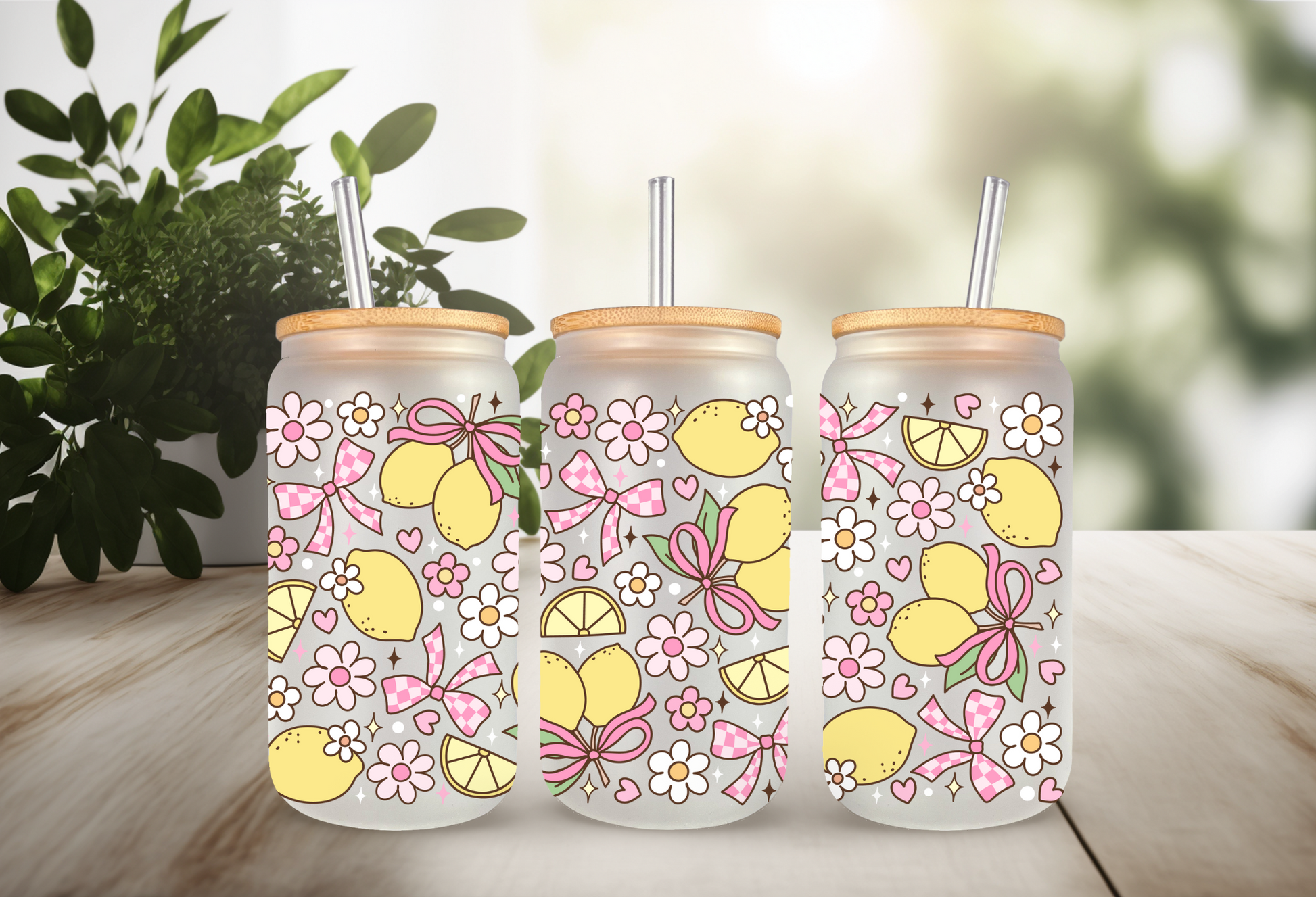 UVDTF Wrap Lemon Daisy Bow Checkered for 16oz Can Glass Mug Tumbler, Ready to apply, Permanent Waterproof Adhesive
