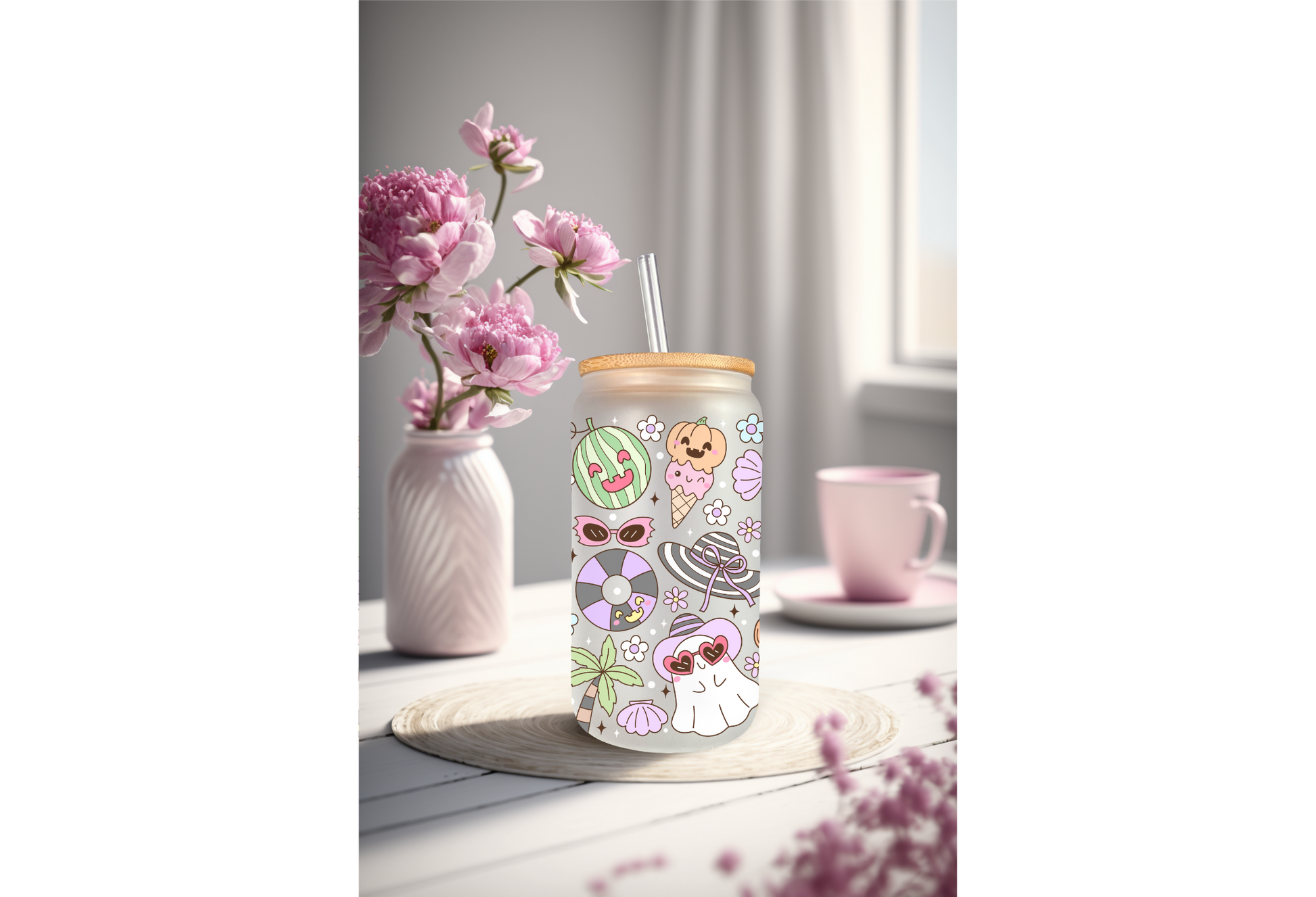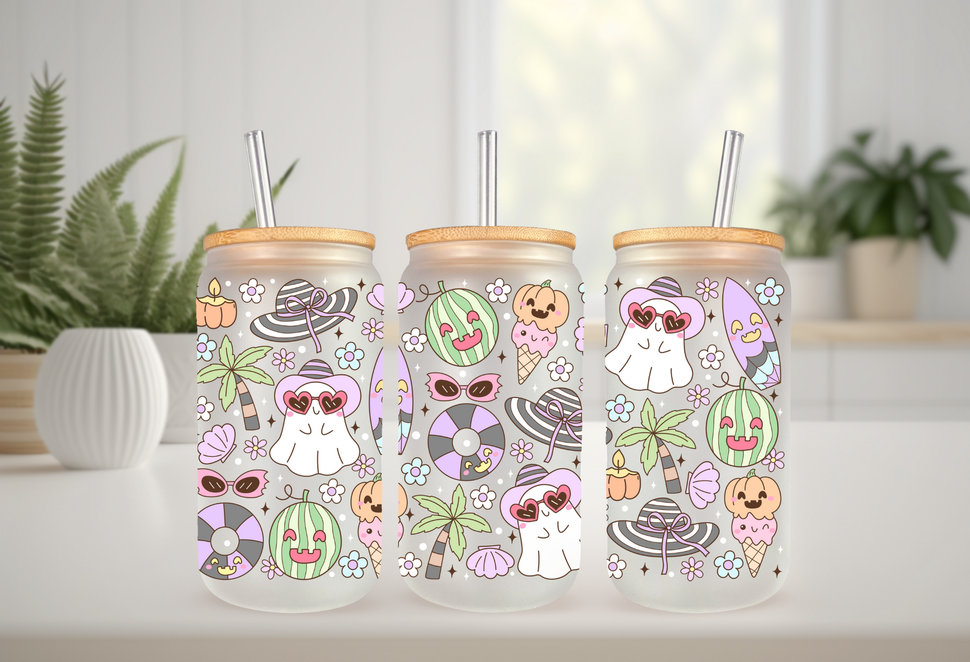 Enhance your 16oz can glass mug or tumbler with the UVDTF Wrap Spooky Ghost Summer design. This ready-to-apply wrap features a permanent waterproof adhesive, ensuring long-lasting decoration that withstands daily use. Perfect for adding a festive, spooky touch to your drinkware while maintaining durability and ease of application.