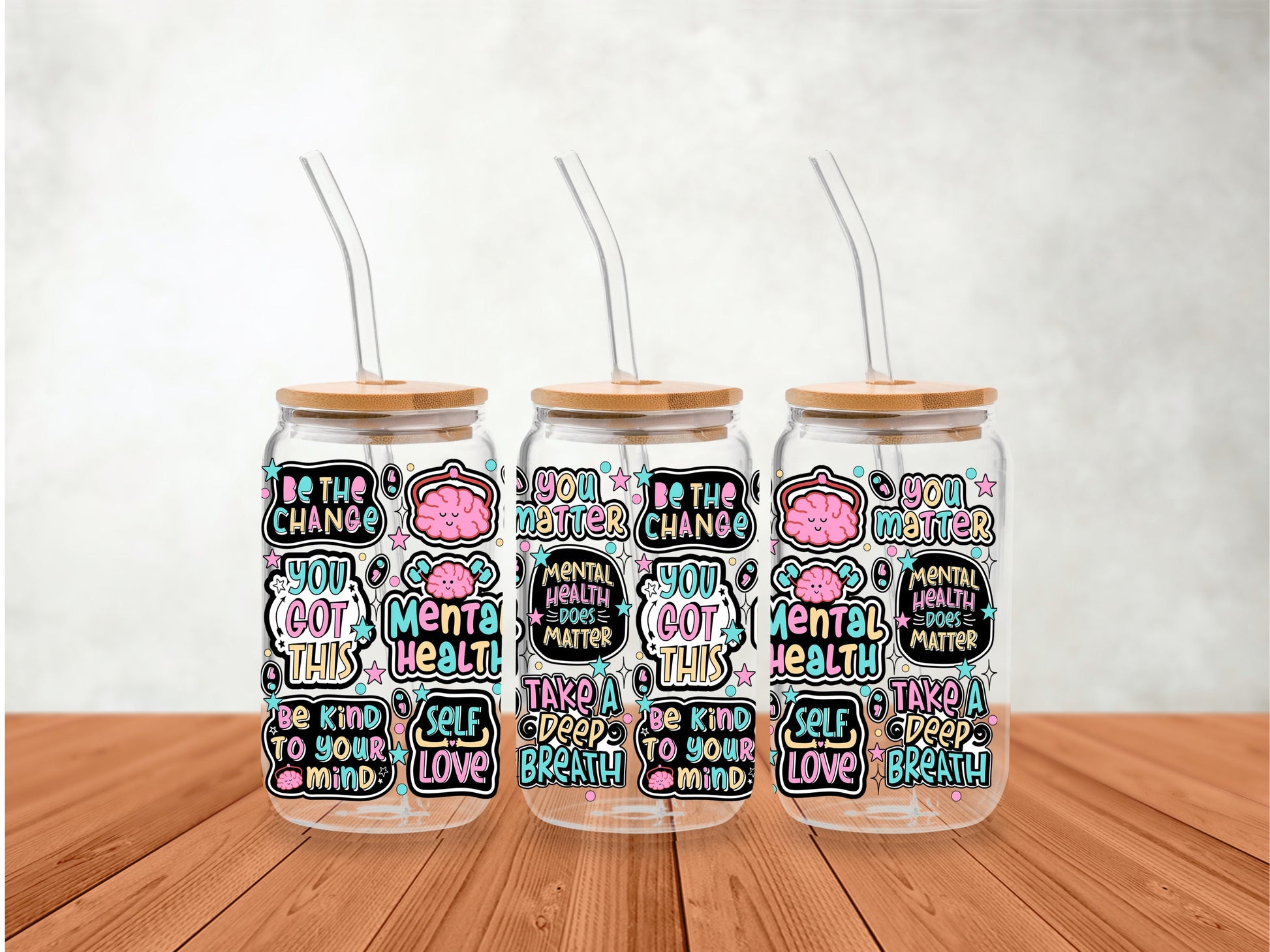 UVDTF Wrap Mental Health Matters 16oz Can Glass Mug Tumbler, Positive Quotes, Ready to Apply, Permanent Waterproof Adhesive