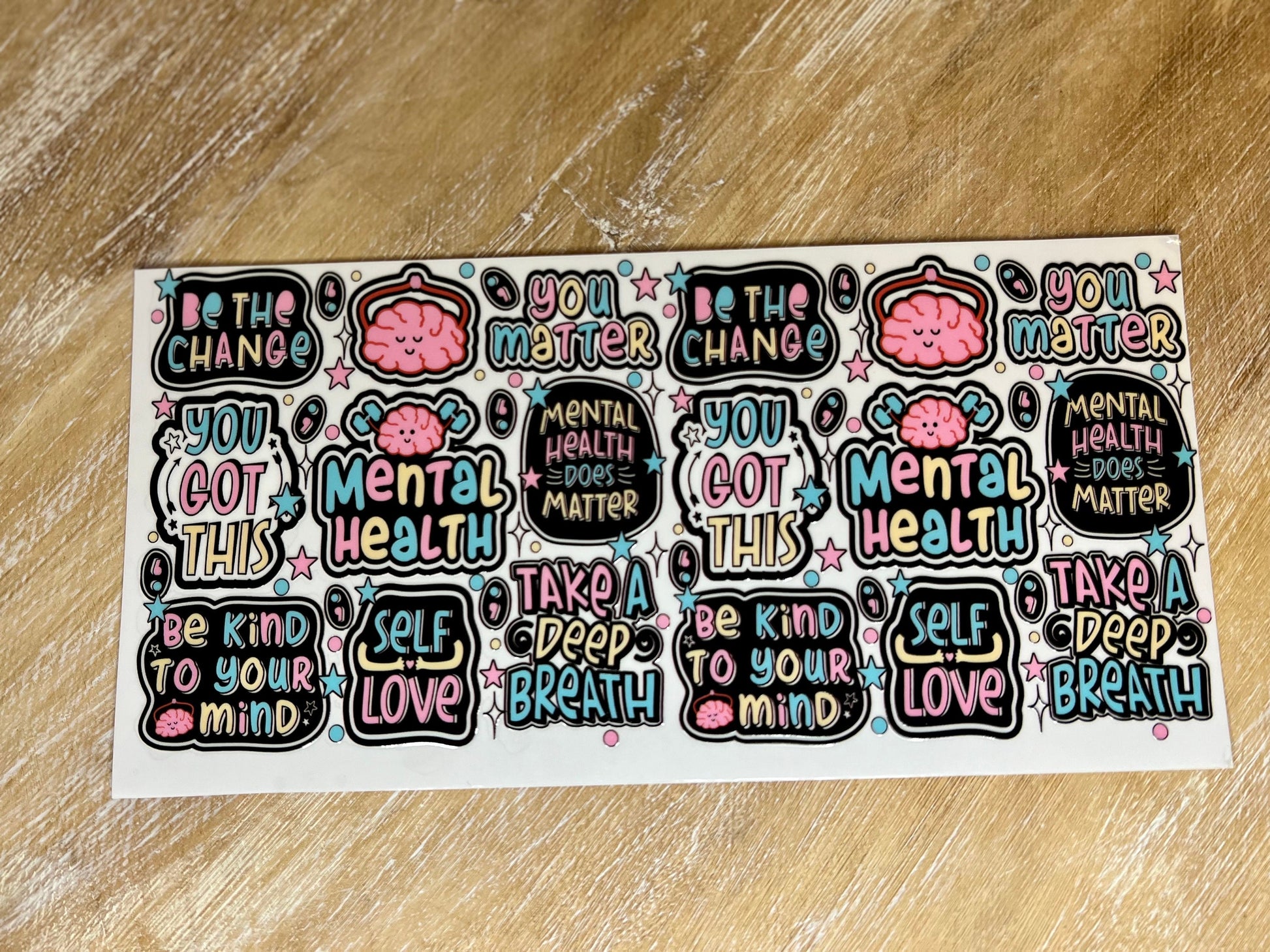 Decorate your cups with UVDTF's Mental Health Matters. This ready-to-apply wrap features positive quotes and utilizes permanent, waterproof adhesive for long-lasting design. Show your support for mental health with this versatile and impactful product.