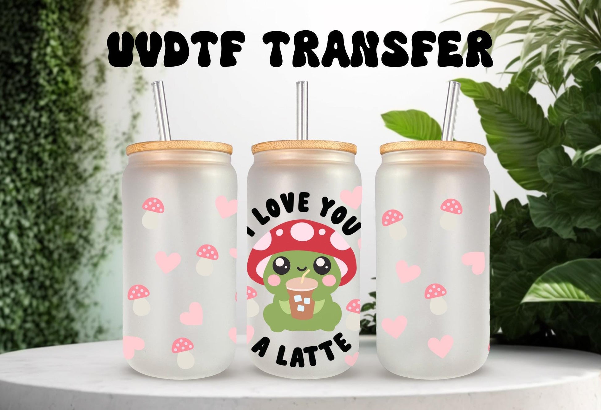 UVDTF Wrap Mushroom Frog Love You A Latte, 16 oz Can Glass Mug Tumbler, Mushroom Wrap, Ready to Apply, Permanent Waterproof Adhesive