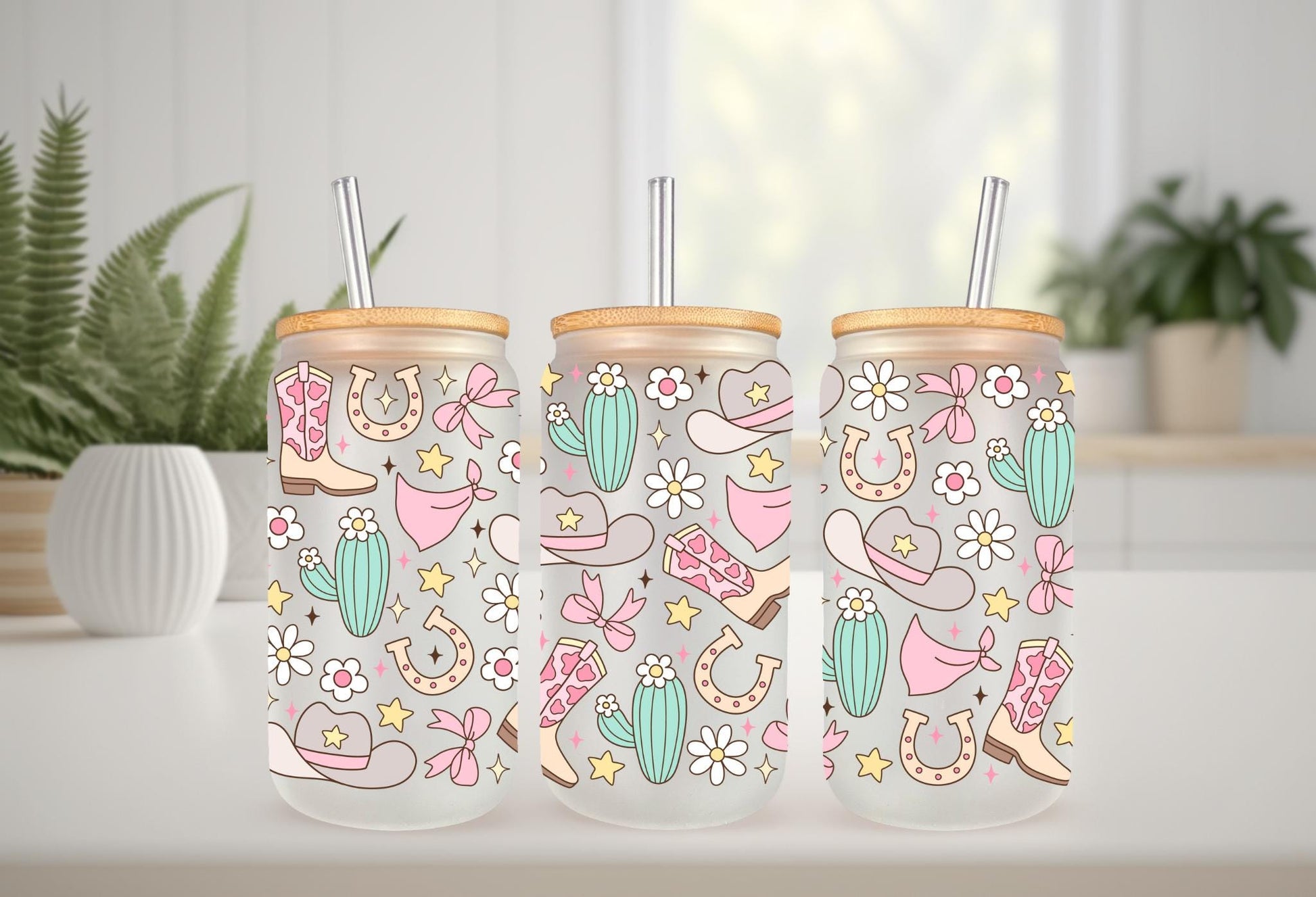 This UVDTF Wrap Pastel Bow Cowgirl is perfect for decorating your 16oz Can Glass Mug Tumbler with a charming Daisy Wrap. Ready to apply with permanent, waterproof adhesive, this wrap adds a touch of style to your cups. Transform your cups into a personalized work of art with this wrap.