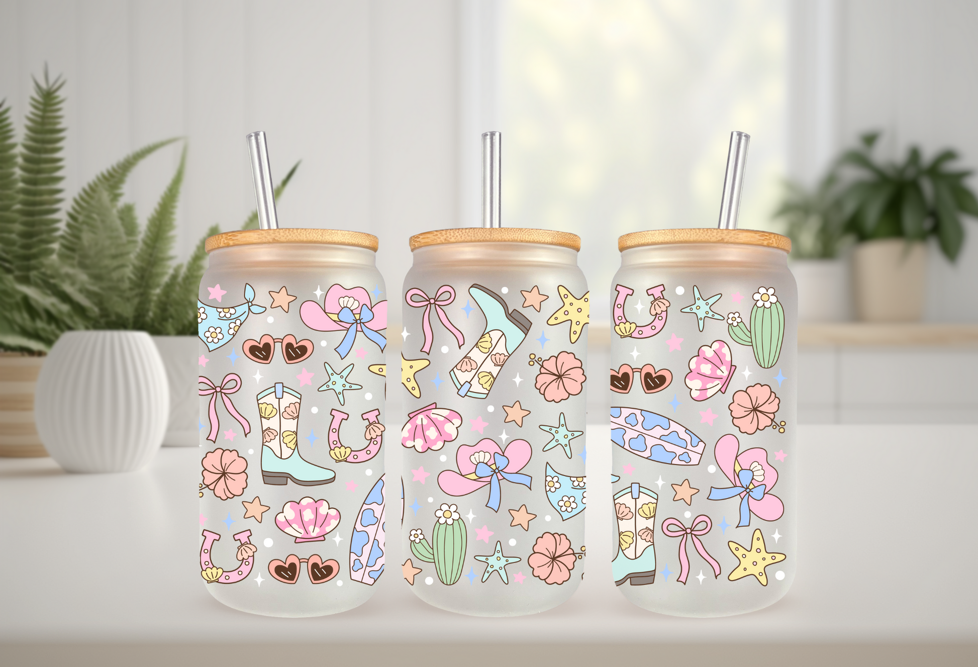 This UVDTF Wrap Coastal Cowgirl is perfect for decorating your 16oz Can Glass Mug Tumbler with a charming Daisy Wrap. Ready to apply with permanent, waterproof adhesive, this wrap adds a touch of style to your cups. Transform your cups into a personalized work of art with this wrap.