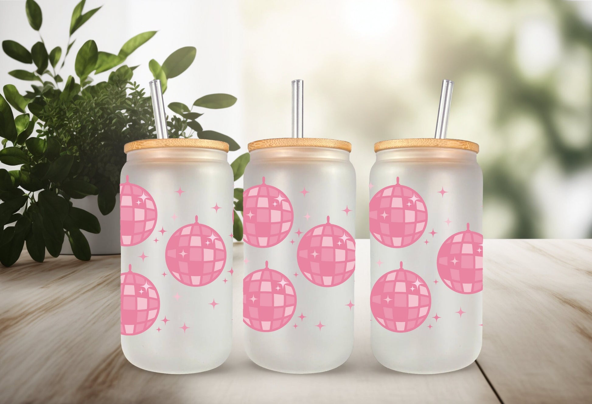 UVDTF Wrap Pink Disco Ball 16 oz Can Glass Mug Tumbler, Ready to apply, Permanent Waterproof Adhesive, Add on a Can Glass