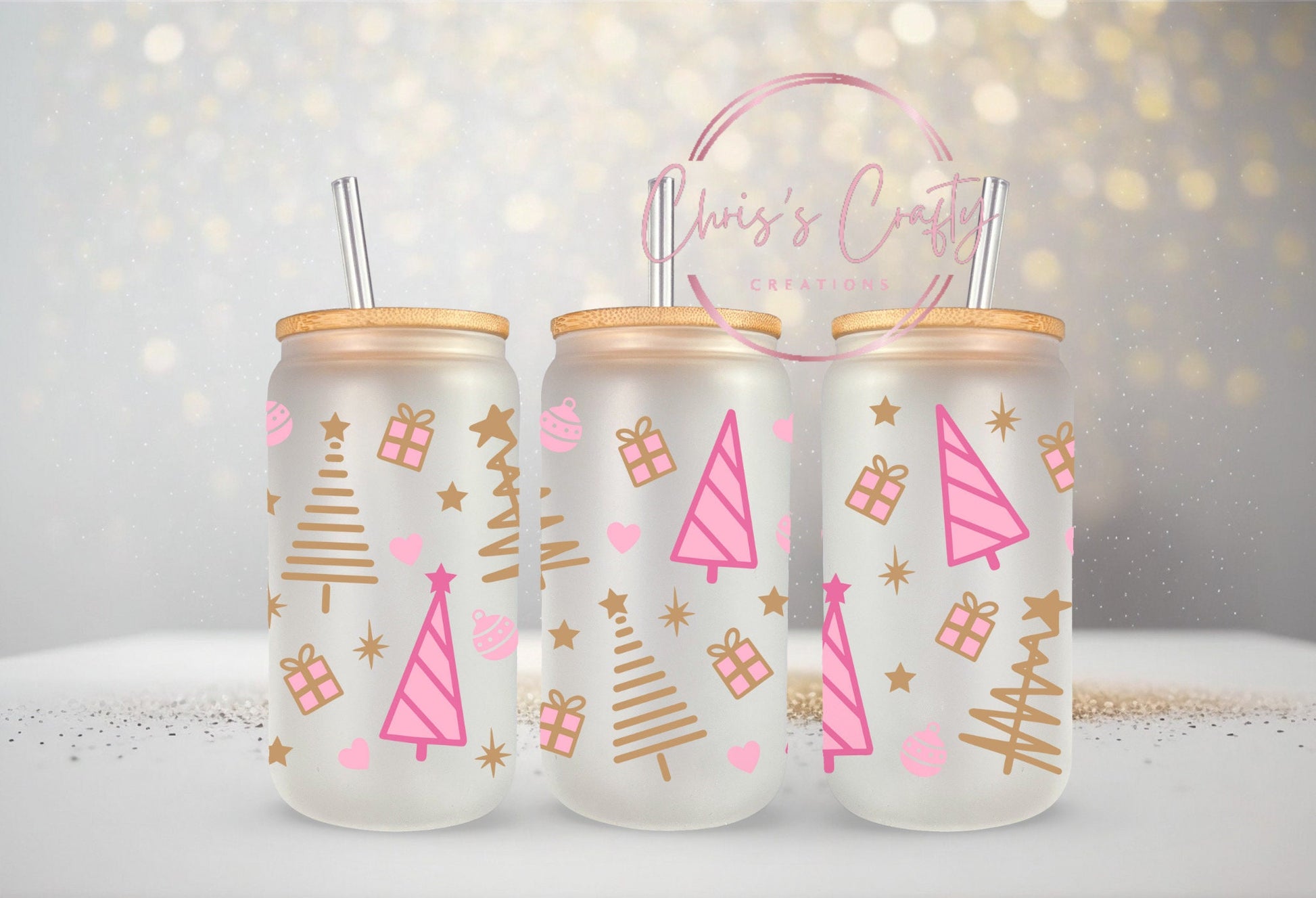 UVDTF WRAP Pink Gold Christmas Trees for 16oz Can Glass, Mug, Tumbler, Ready to Apply, Waterproof Permanent Adhesive