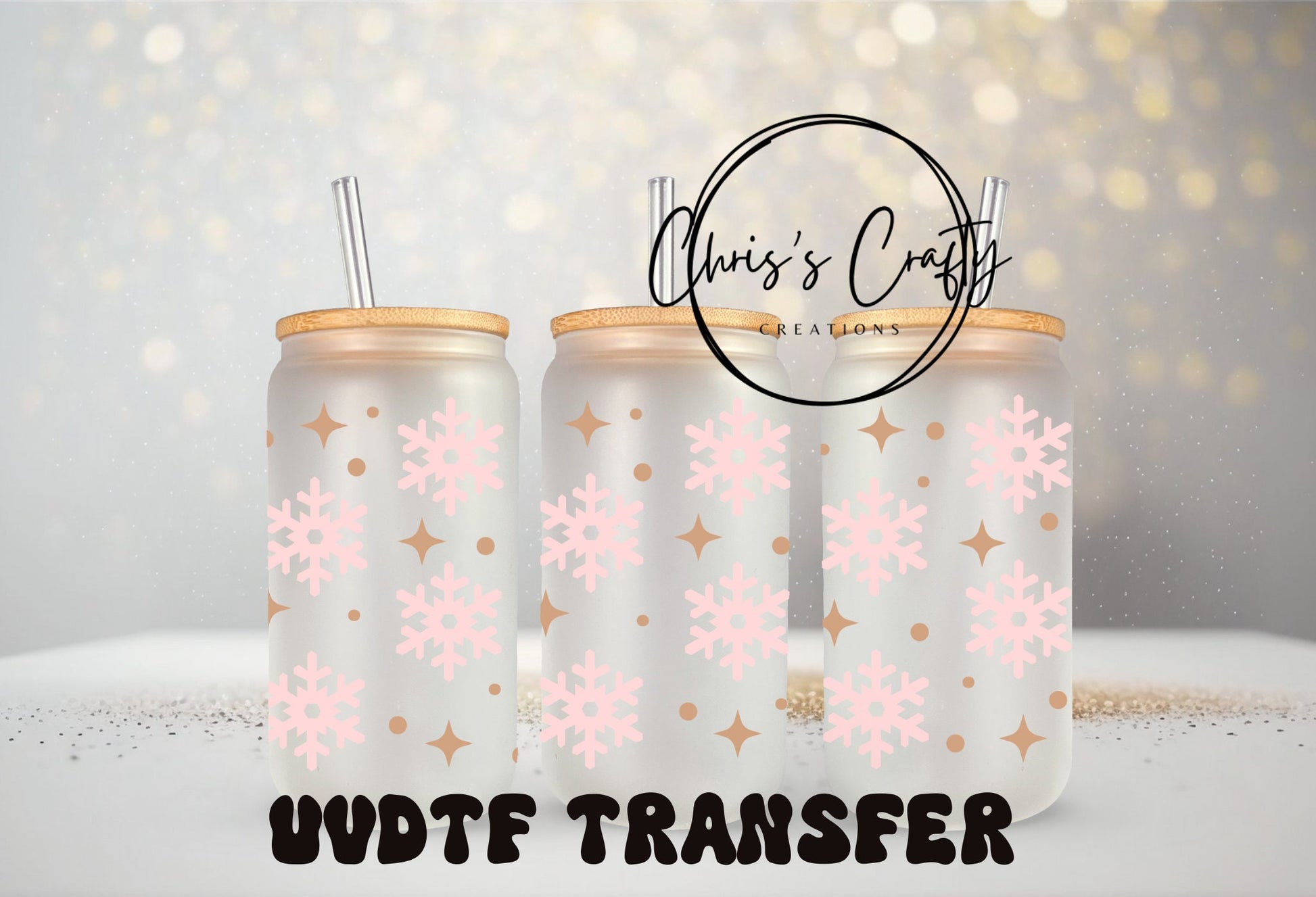 UVDTF Wrap Pink Snowflakes 16oz Can Glass Mug Tumbler, Ready to Apply, Permanent Waterproof Adhesive
