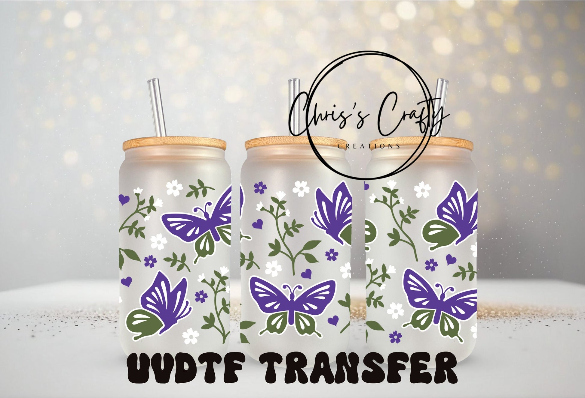 UVDTF Wrap Purple Butterfly 16oz or 20oz Can Glass Mug Tumbler, Ready to apply, Permanent Waterproof Adhesive