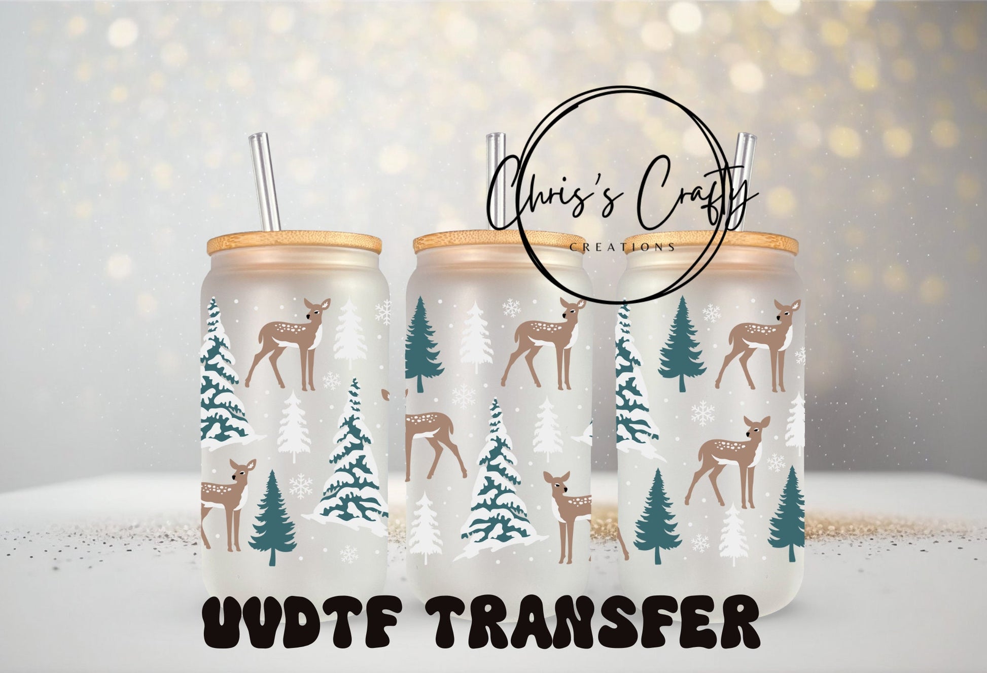 UVDTF WRAP Reindeer Trees Winter Snow 16 oz Can Glass Mug Tumbler, Ready to apply, Waterproof Permanent Adhesive