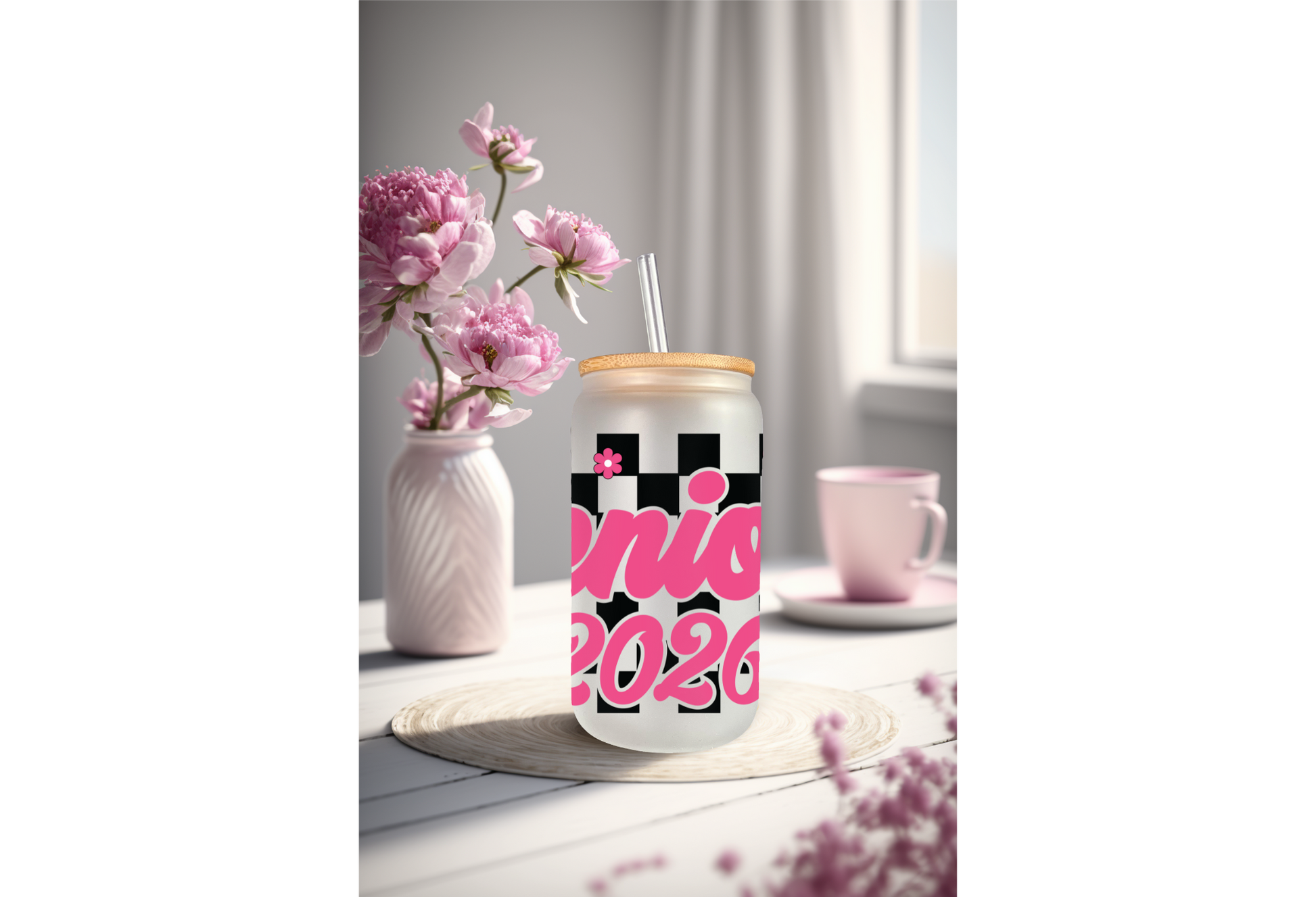 UVDTF Wrap Senior 2026 Black Pink White Checkered for 16oz Can Glass, Mug or 40oz Tumbler, Graduate 2026, Ready to Apply, Permanent Adhesive, Exclusive This listing is for one (1) adhesive cup wrap/decal. Glass is not included. Application Instructions DO NOT USE ALCOHOL TO CLEAN CUP! 1. Peel backing on right or left side creasing it to stay. 2. Place the transfer on the cup ensuring design is straight and positioned correctly. (Once transfer is on the glass it cannot be taken off so please make sure you are positioning your transfer correctly) 3. Press the transfer down, working from right to left or vise versus, pushing out any bubbles. 4. Rub all over the design with your fingers. The more rubbing the better. 5. Peel clear film off slowly and you're done! Hand wash only please We are not responsible for application mishaps. *Please note: Not all brands of 16 oz. glass cups have the exact same measurements. They can differ by a couple of millimeters. Our wraps have been measured to fit Libbey glass cans. Adjustments may be necessary*