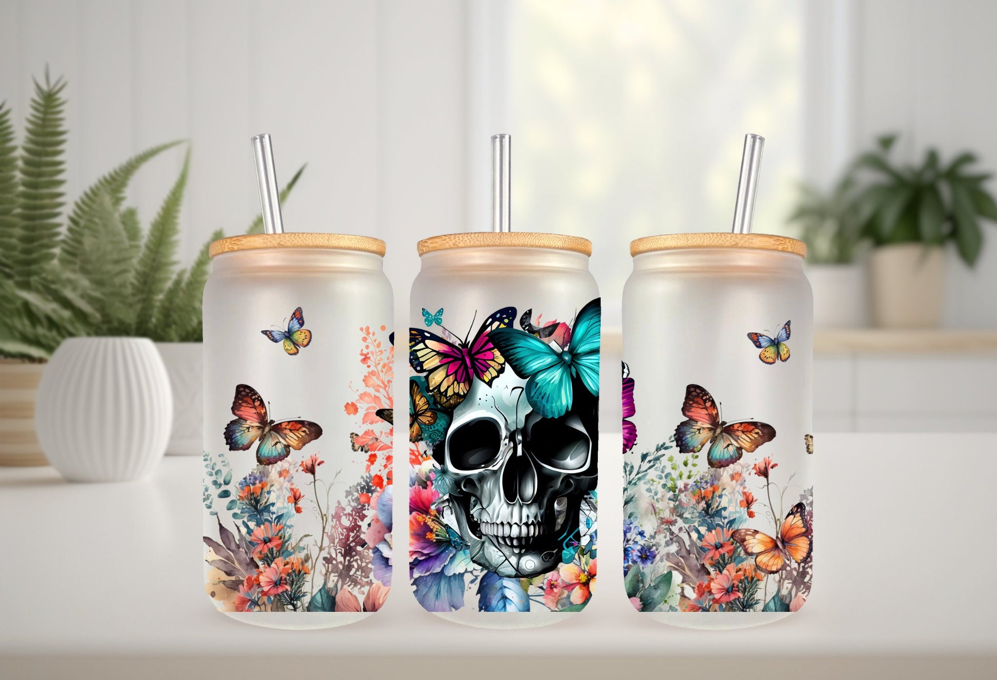 Glass Mug Tumbler Wrap – 16oz Can Skull Floral Butterfly Double Sided Sticker