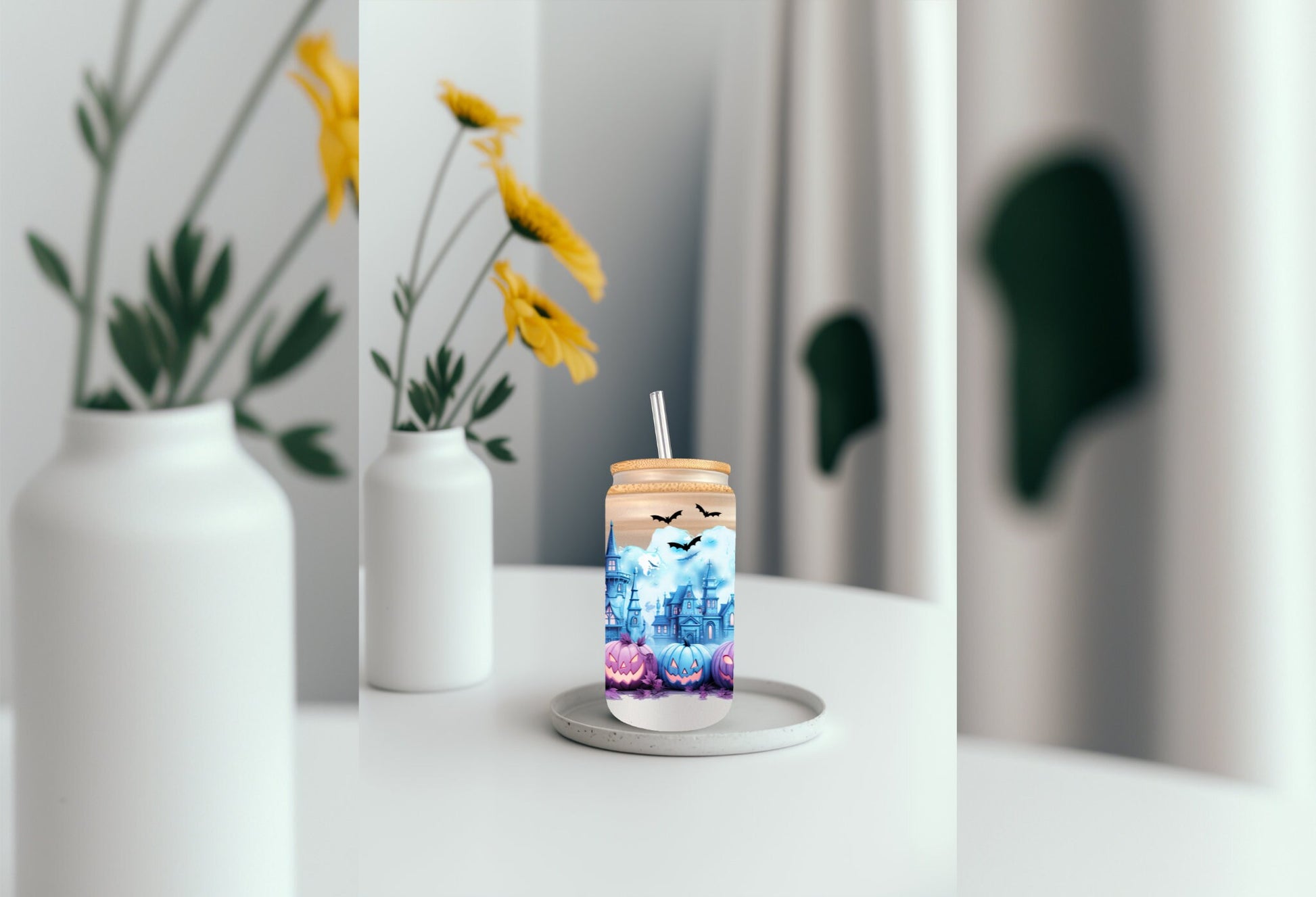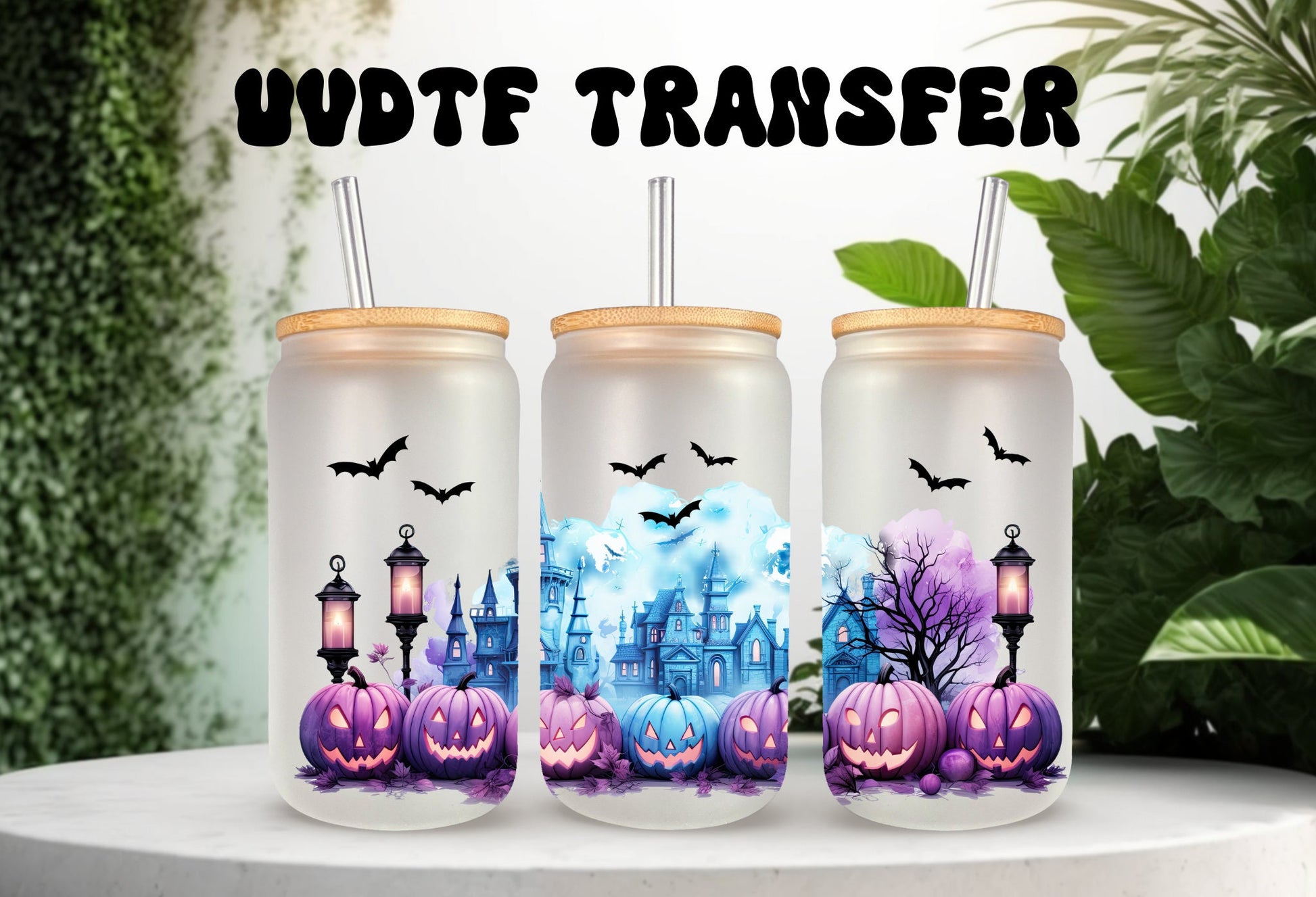 UVDTF Wrap Spooky Bats Pumpkins Haunted House 16 oz Can Glass, Mug, 40 oz Wrap, Ready to apply, Permanent Adhesive, Double sided print