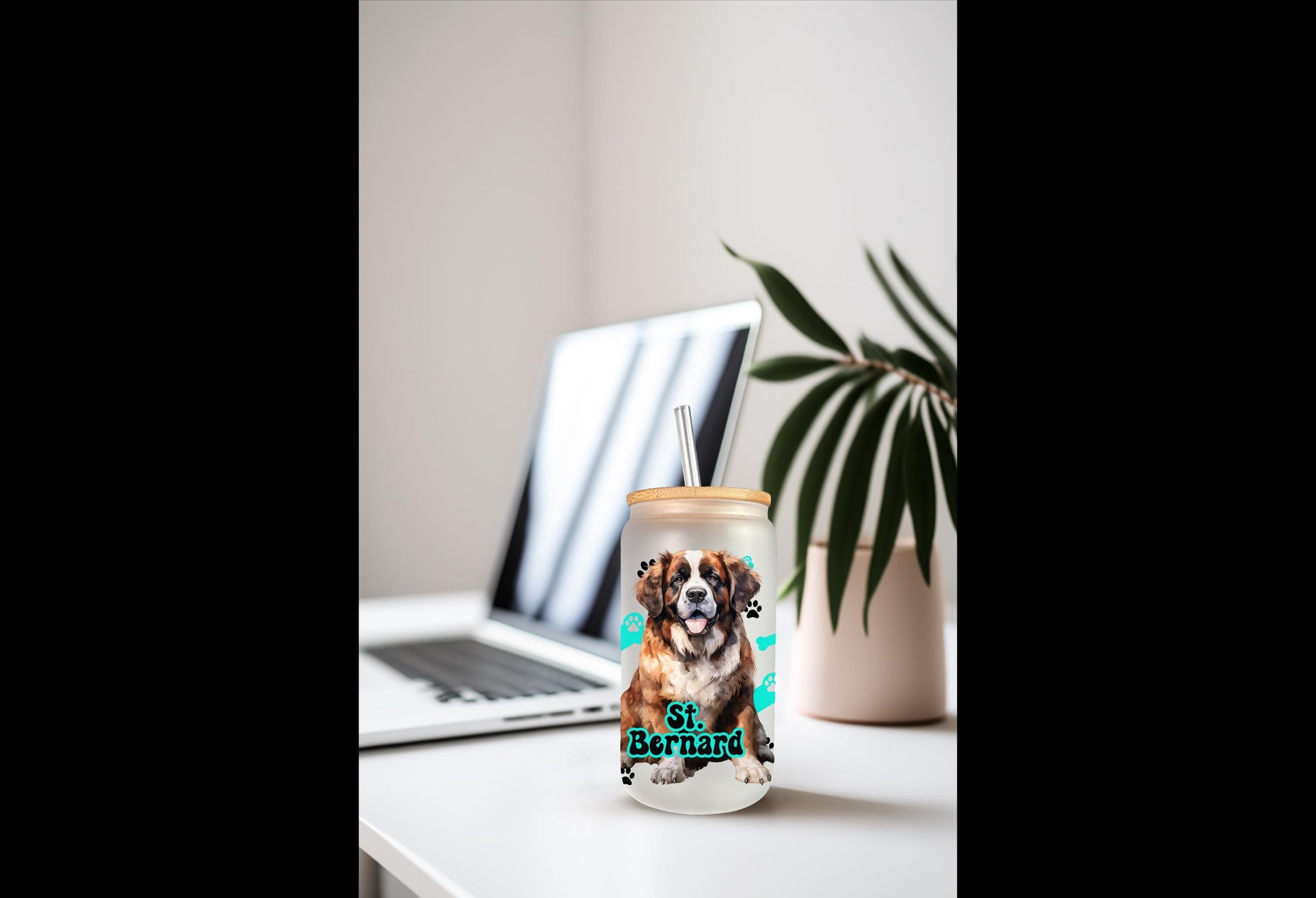 UVDTF Wrap St. Bernard 16oz Can Glass Mug Tumbler, Colorful Dog Wrap, Ready to apply, Permanent Waterproof Adhesive, Bundle Save Option