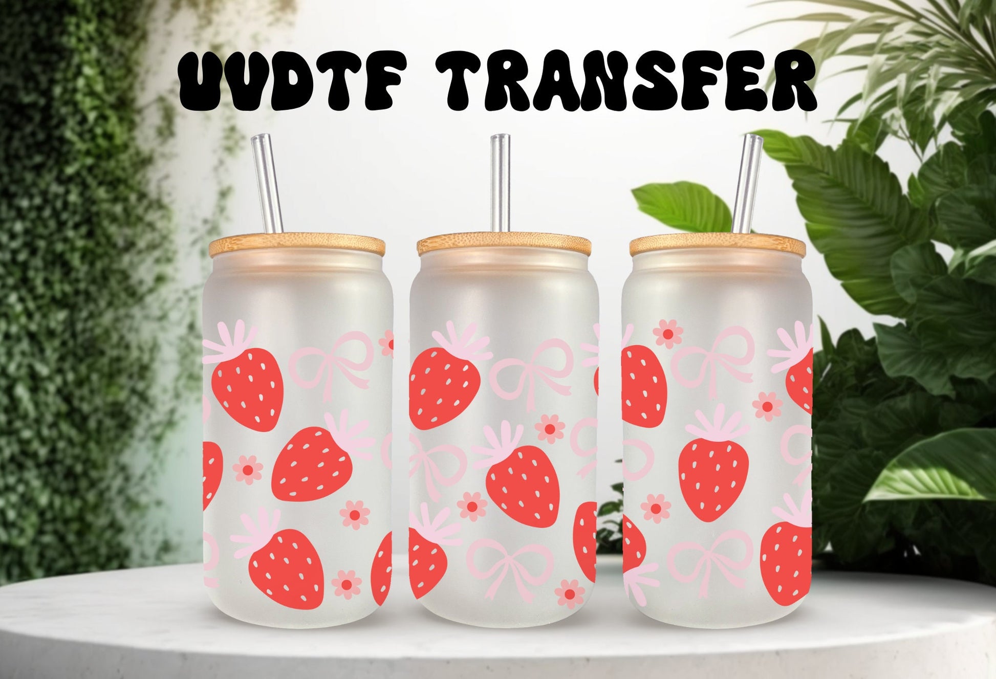 UVDTF Wrap Strawberry Coquette Bows for 16 oz Can Glass, Mug, Tumbler, Mug, Ready to Apply, Permanent Waterproof Adhesive, Apply to Cup