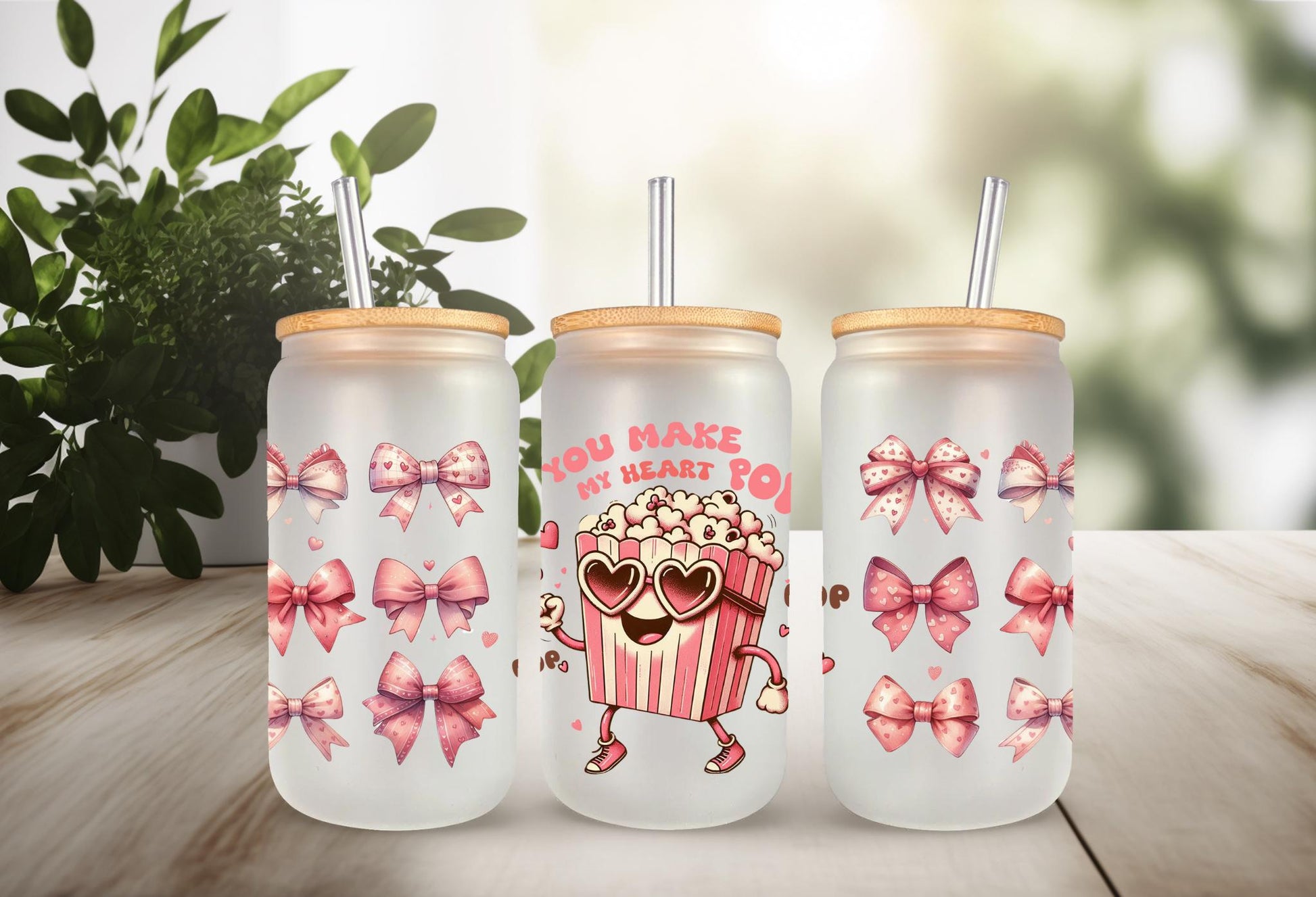 UVDTF Wrap Valentine’s Heart Pop Popcorn 16oz Can Glass Mug Tumbler, Valentine wrap, Ready to Apply, Permanent Waterproof Adhesive