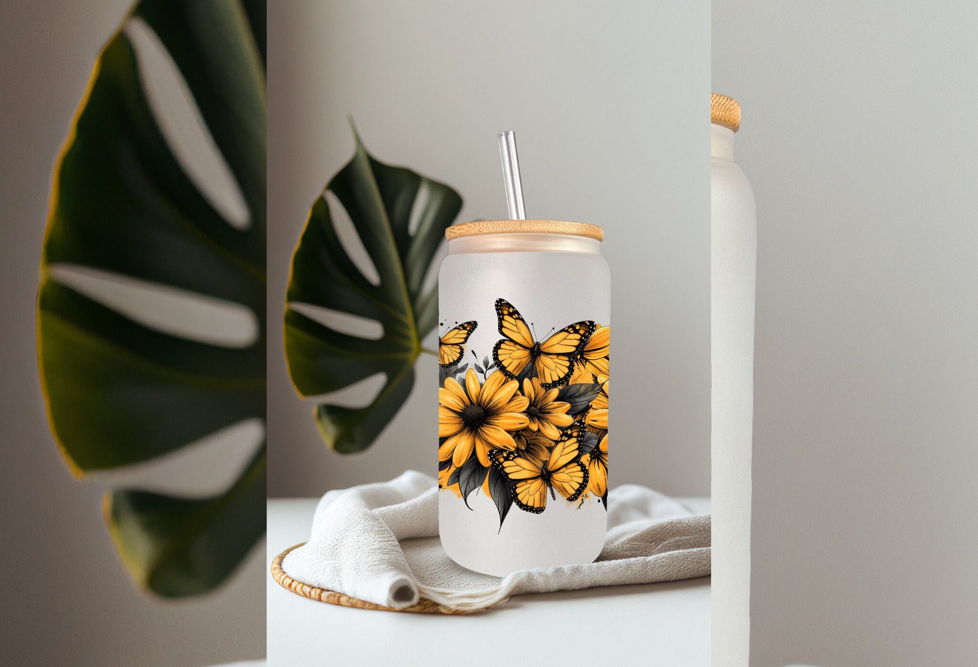 UVDTF Wrap Yellow Daisies Butterflies 16oz Can Glass Mug Tumbler Wrap, Ready to apply, Permanent Adhesive, Double sided option